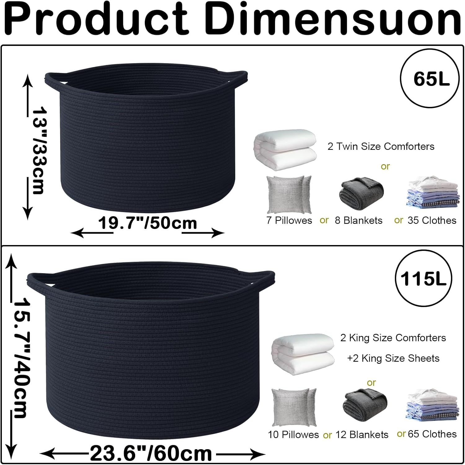 - 【Large Laundry Blanket Basket】19.7"L x 19.7"W x13"H Laundry basket for organizer,65L rope large cotton blanket basket with handle.Please allow 1 - 2 cm (0.4" - 0.8") for deviations due to folded transportation.