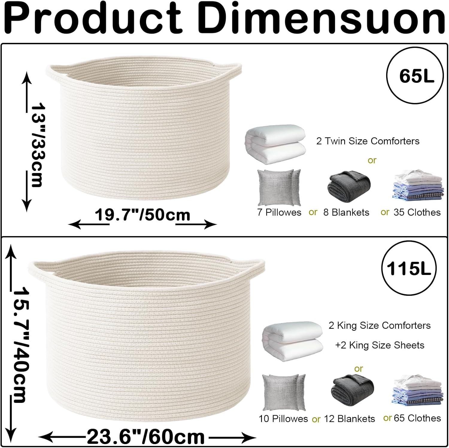 - 【Large Laundry Blanket Basket】23.6"L x 23.6"W x15.7"H Laundry basket for organizer,115L rope large cotton blanket basket with handle.Please allow 1 - 2 cm (0.4" - 0.8") for deviations due to folded transportation