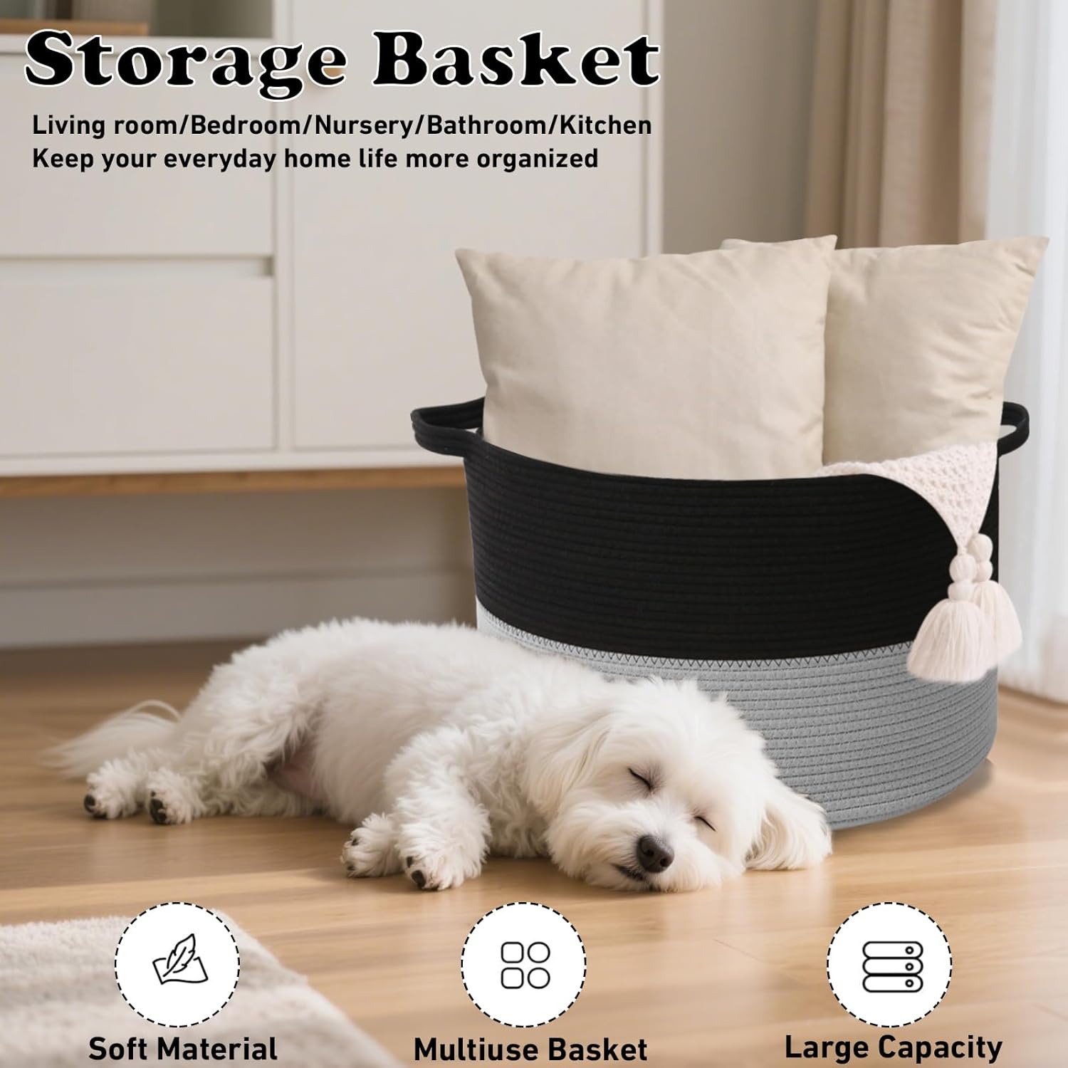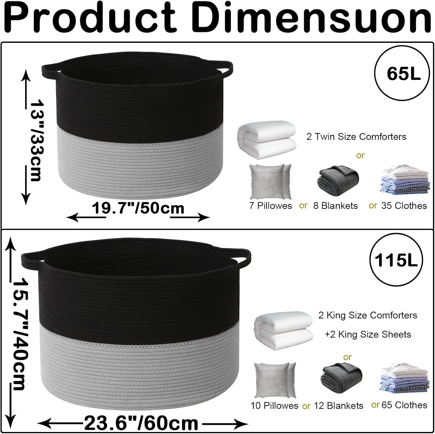 Large Blanket Basket for Organizing,65L Closet Organizers and Storage Bins Box for Shelves Woven Rope Storage Baskets,Living Room,Bedroom,Dorm,Laundry room (Black&Light Grey)