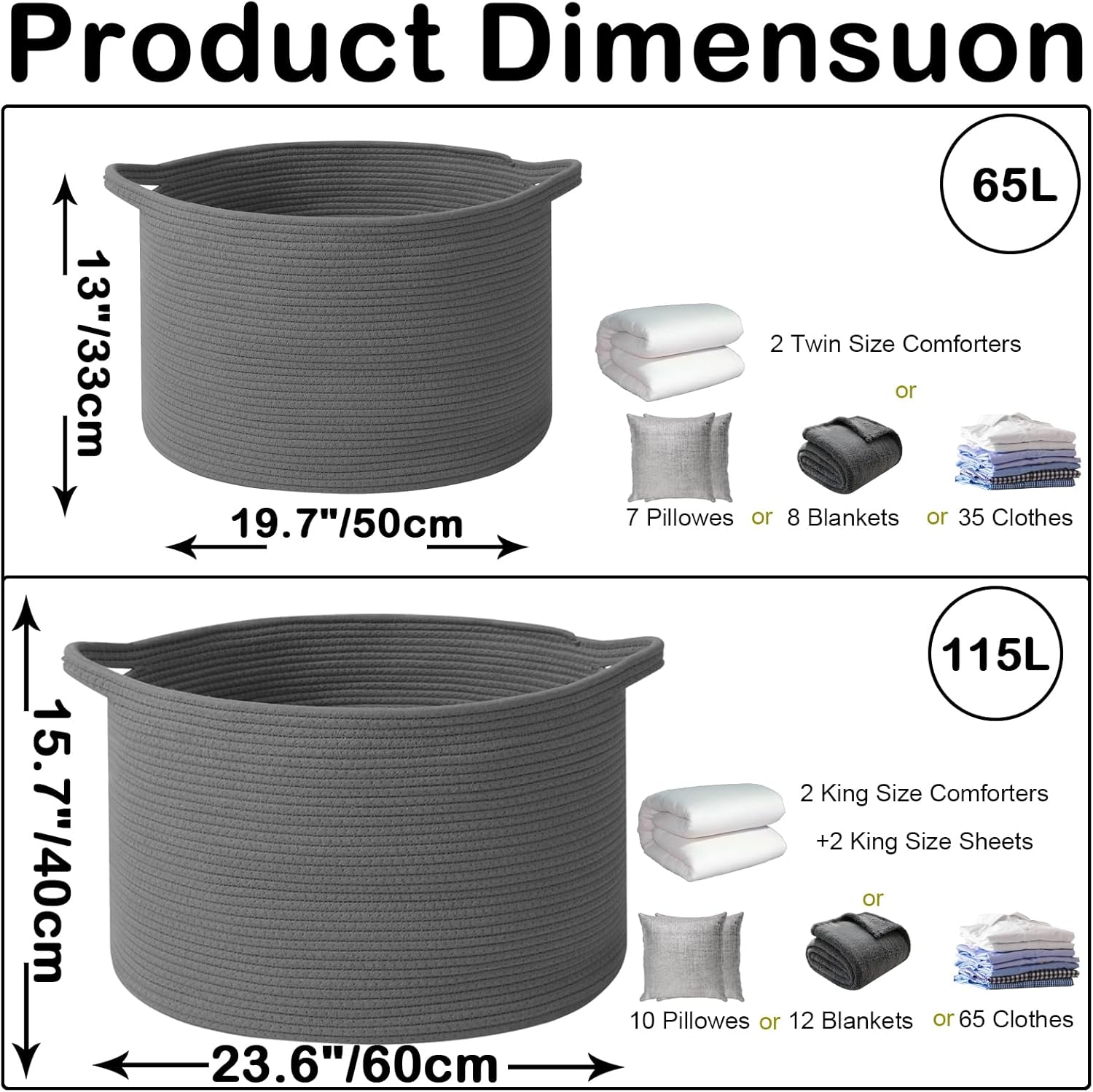 Large Blanket Basket for Organizing,65L Closet Organizers and Storage Bins Box for Shelves Woven Rope Storage Baskets,Living Room,Bedroom,Dorm,Laundry room (Dark Grey)