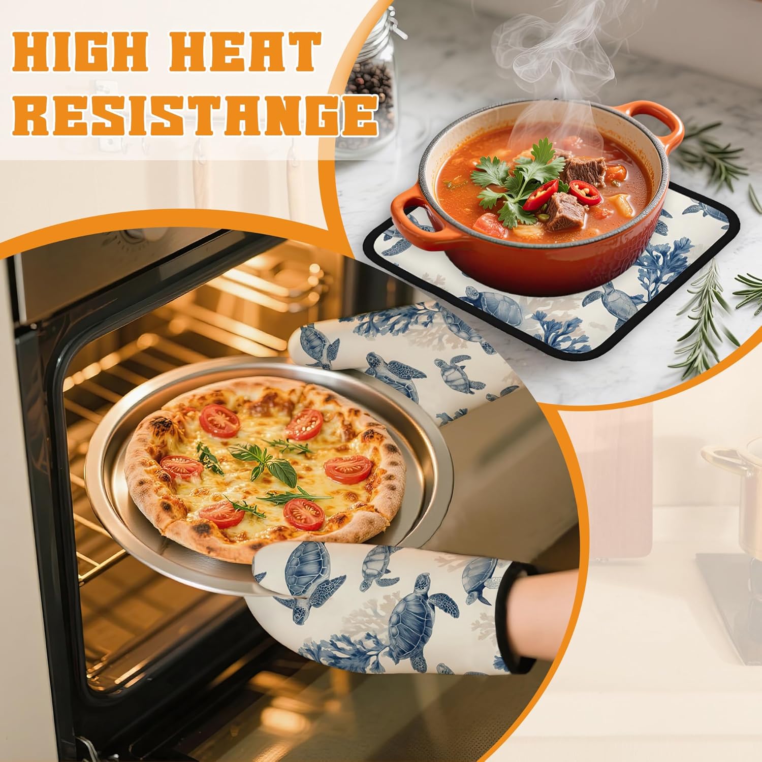 Turtle Coral Oven Mitts and Pot Holders Set,Kitchen Oven Gloves and Pot Holder with Heat Resistant Non Slip for Cooking Baking Grilling(4 Piece Set)