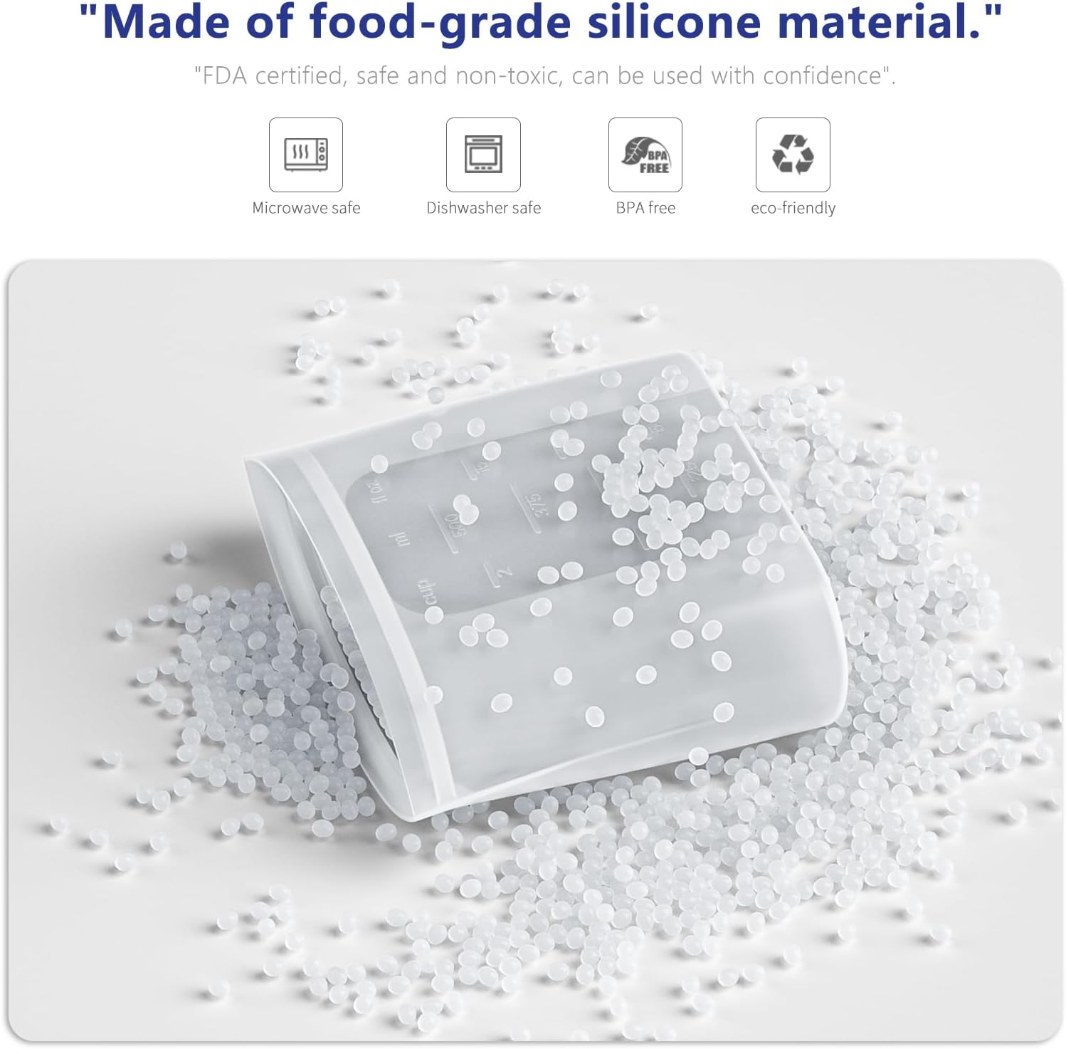 - Easy Seal and Easy use:Upgraded non-slip zipper design ensure an airtight leakproof seal, perfect for storing and preserving food.Our silicone bags can stand up and easy for keep soup or juices in it. When using storage bags, remove excess air and pinch the seal tightly.These bags are Small figure but large capacity, effectively saving your refrigerator space.