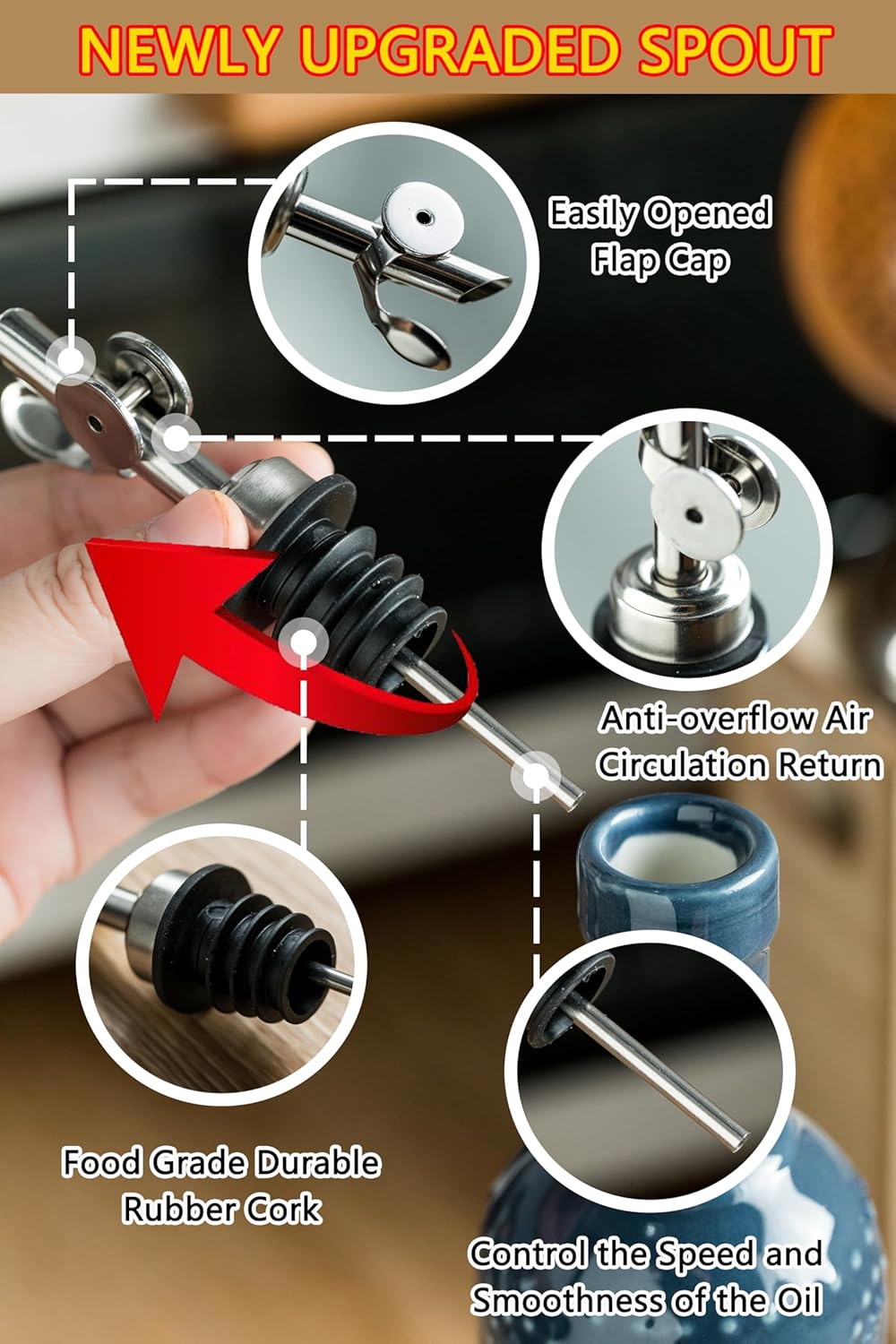 - Upgraded Silicone Spout2.0: Improves popping up &is hygienic. We fixed the spout popping issue with an upgraded silicone design. It creates an airtight seal to lock in freshness and block dust. Gravity pour lets you dispense oil or vinegar without touching the spout, keeping it clean and easy for kids or the elderly to use.