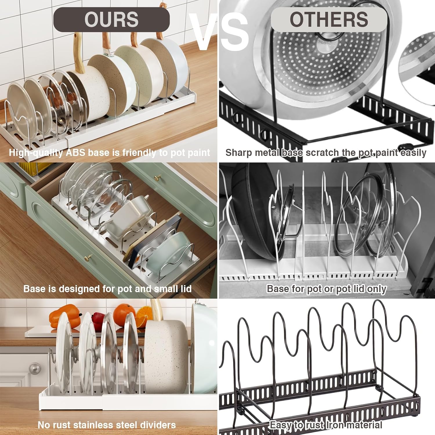- 【Expandable Design】It measures (12.6"~22.4") L*7.9" W*6.3" H, which can be stretched freely to adapt to different cabinet sizes, suitable for small apartments to large kitchens, large capacity to meet the storage needs of different pots and pans, compatible with a full range of kitchen utensils from frying pans to soup pots.
