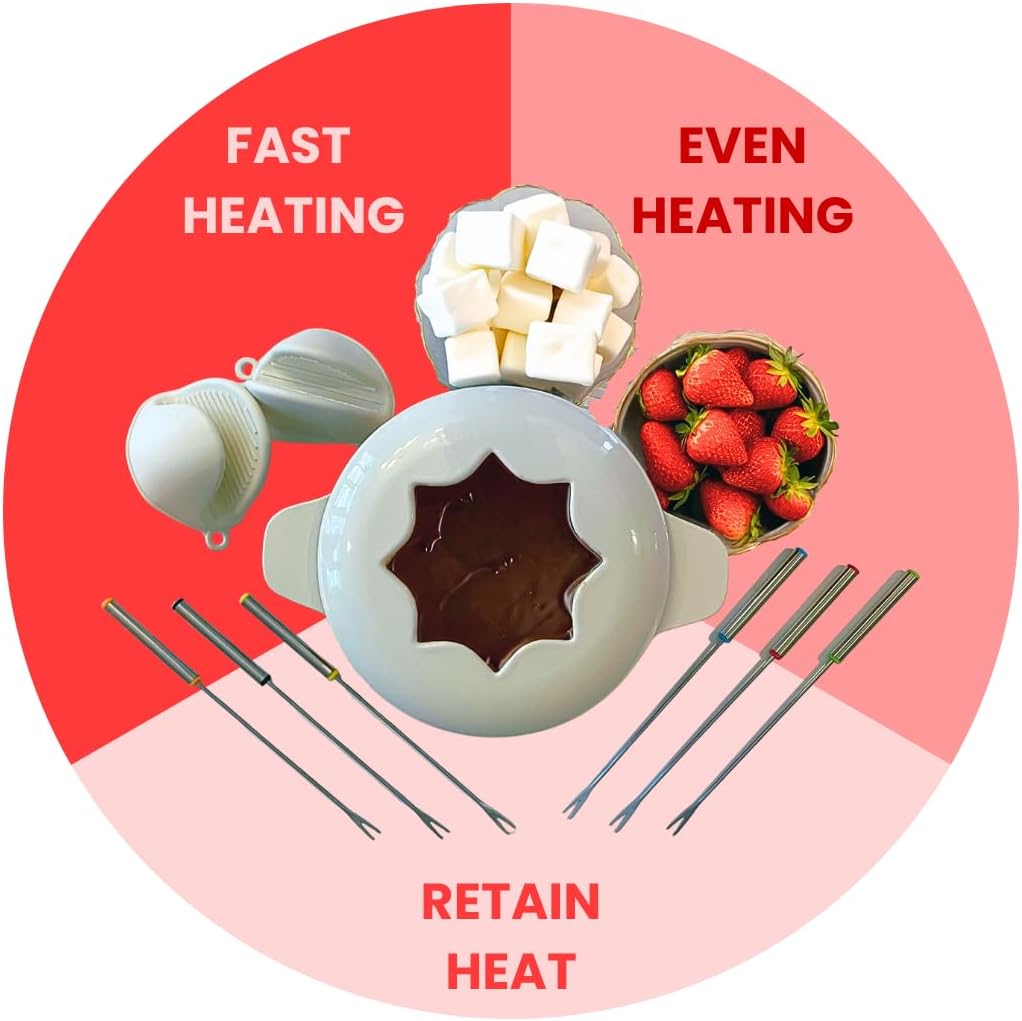 - [DELICIOUS FONDUE FOR HOURS] Perfect for melting swiss cheese, chocolate, oil and broth for meat, easily adjust the temperature with the burner, while the cast iron pot keeps your fondue warm with excellent heat retention and distribution