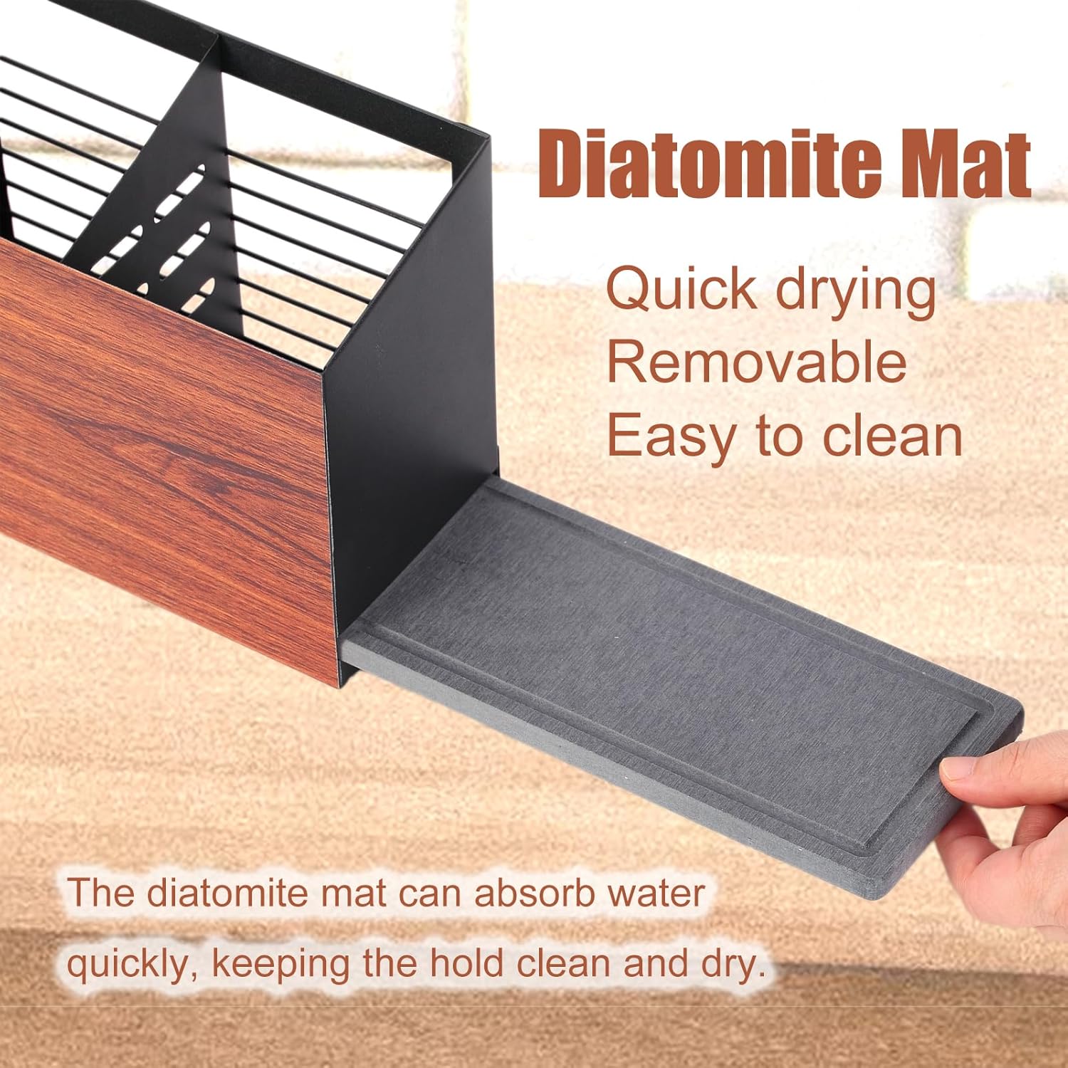 - Removable Drying Mat -- The drying mat is made from diatomite which is able to absorb water quickly and easy to clean.
