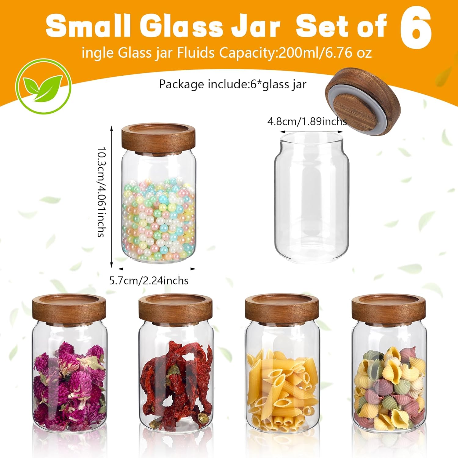 - 【WIDE APPLICATIONS】6oz Glass kitchen canisters for pantry organization and storage are suitable for storing various dried ingredients to retain their freshness, with clear glass jars, you can easily see inside and quickly find the ingredients you need.Glass jars with wood lids perfect for storing dry food , such as,cookies,dried beans,pepper,oatmeal,jams,chutneys, rice, flour, tea, coffee, biscuits, candy,cheese,flour, sugar, seeds,etc. Keep your kitchen tidy and safe,saving space and convenient .