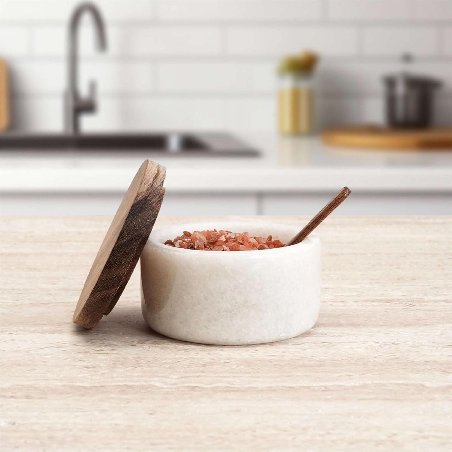 - ELEGANT & FUNCTIONAL DESIGN – This Marble Salt Cellar with Acacia Wood Lid features a clean, minimalist style and natural materials that add timeless charm to your kitchen, bathroom, or dining table.
