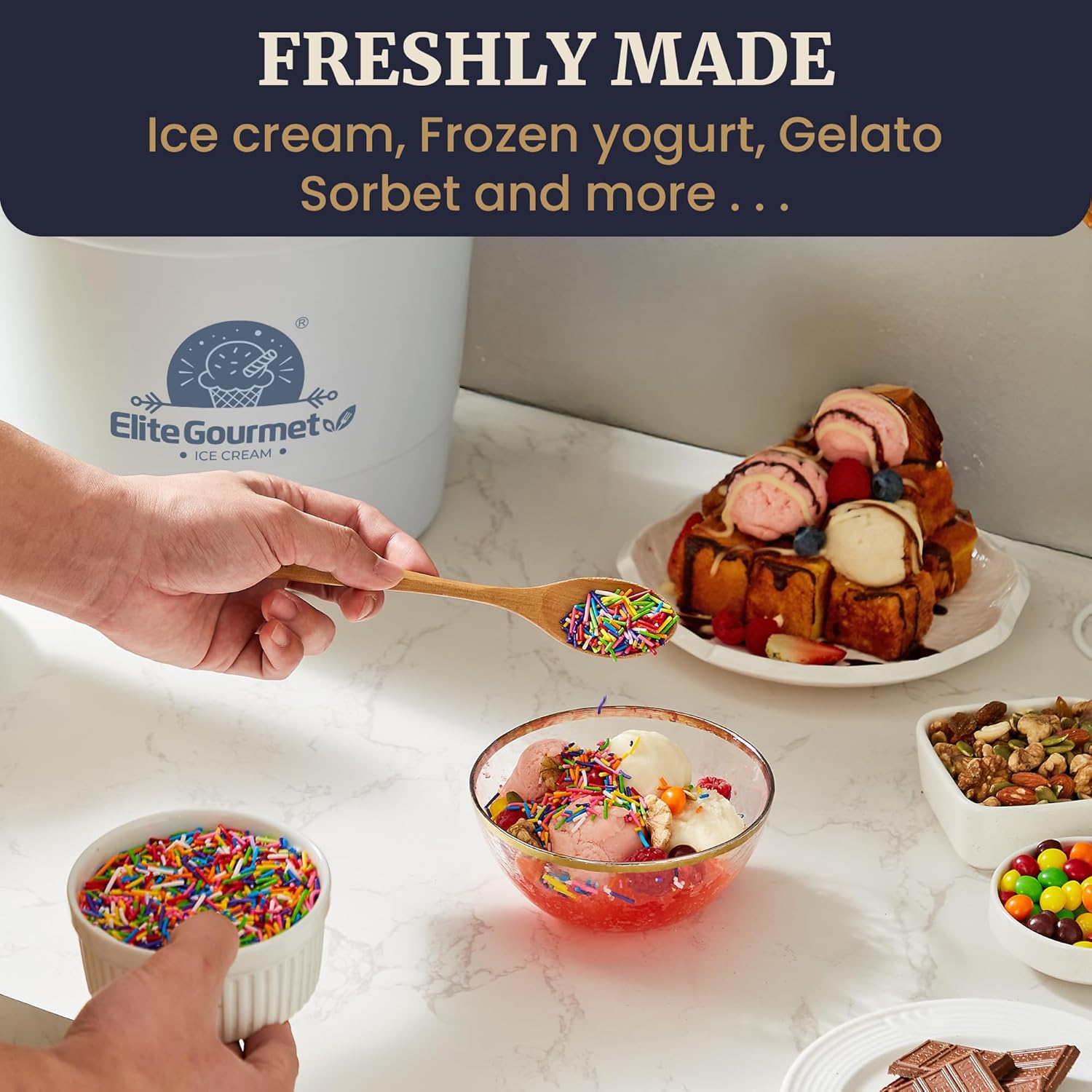 - FUN, REFRESHING & PORTABLE: It’s always Summertime with Elite Gourmet’s newest Ice Cream Maker. It’s compact so you can take it anywhere, anytime to enjoy delicious frosty treats with family & friends.