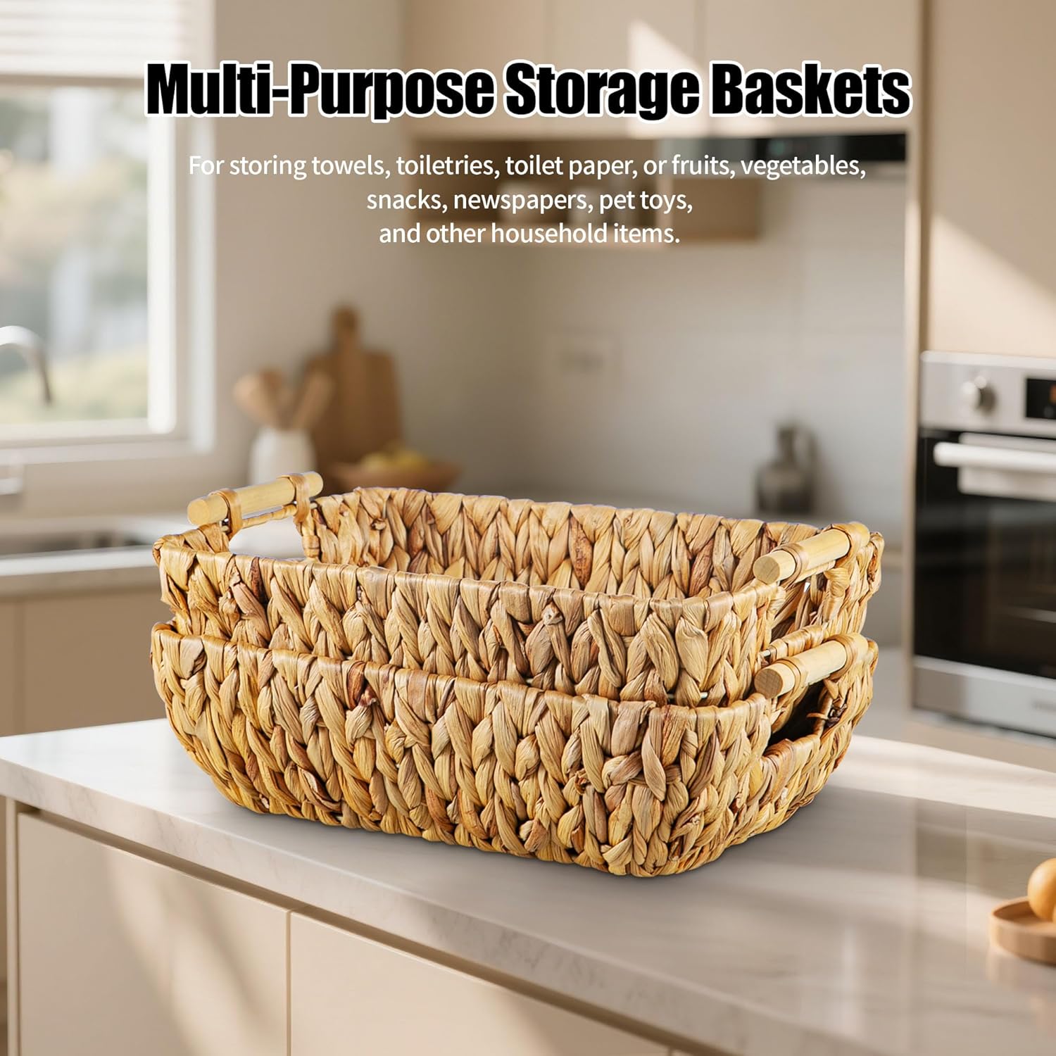 Woven Storage Baskets – Set of 2 Handwoven Water Hyacinth Wicker Baskets with Wooden Handles for Organizing, Decorative Baskets for Laundry Room, Home Decor - 2 Medium