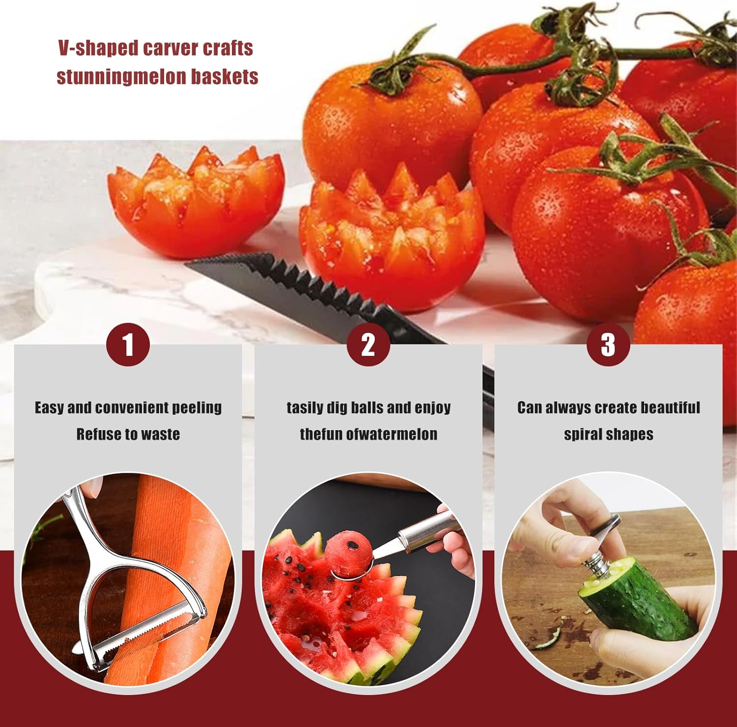 - 【Precision V - Cutting for Artistic Decor】Elevate your garnishes and food presentations with the sharp V - shaped tool. Craft stunning melon baskets, pineapple boats, decorative citrus twists, or intricate designs on apples and cucumbers. It's perfect for parties, healthy snacks, or fun bento boxes.