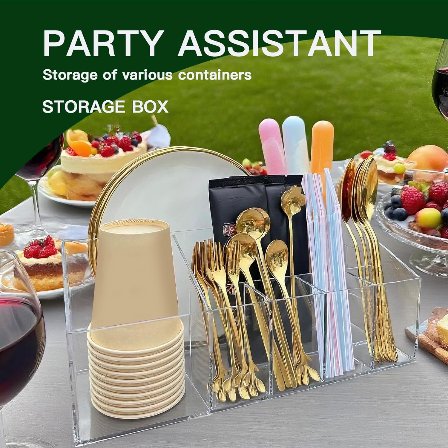 Utensil Holder for Party, Plastic Silverware Holder and Acrylic Cutlery Organizer for Paper Plates, Napkins, Cups, and Silverware - Countertop Caddy for Camping, Picnic, Buffet, Table Entertaining