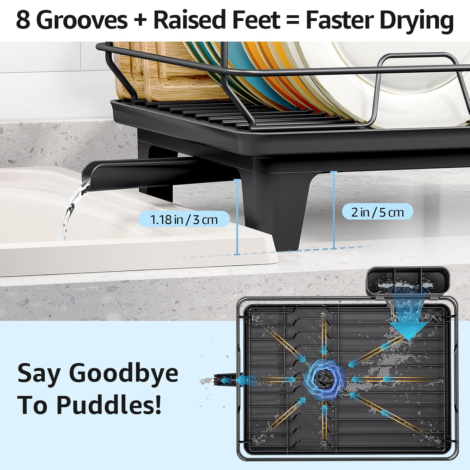 - 【Extra High Feet】 The high feet makes this dish drying rack for kitchen counter suitable for various sinks,and make the dish rack at a certain height from the sink, allowing water to flow smoothly into the sink, thereby keeping the kitchen dry and tidy