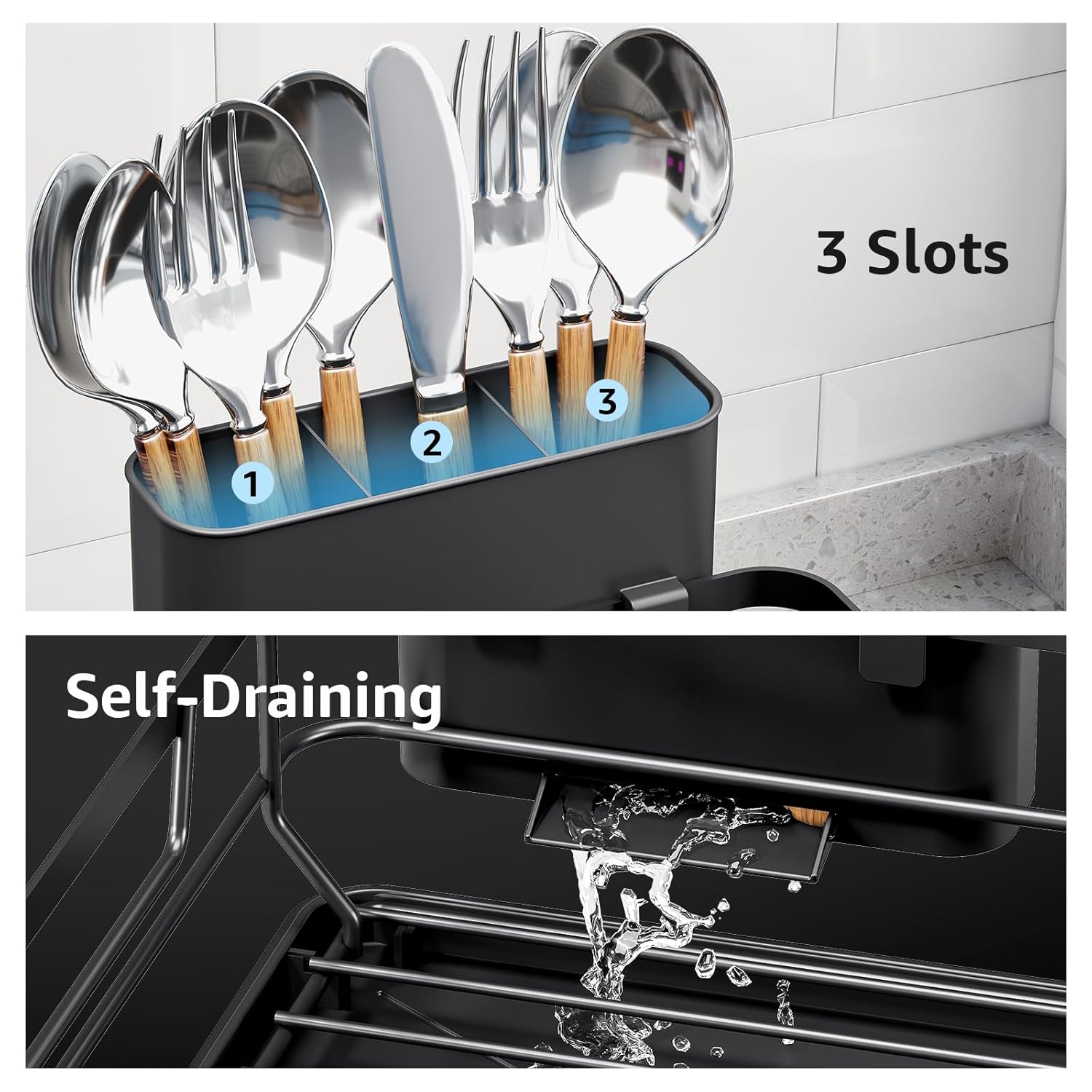 - 【Multifunctional Cutlery Holder Saves More Space】This dish drying rack for the kitchen counter features a hanging external cutlery holder, which frees up valuable space inside. The holder comes with a protruding drain outlet that guides water directly to the drainboard, ensuring efficient water management. Dish rack has 3 compartments to provide dedicated space for your forks, knives, and spoons, keeping your cutlery organized.