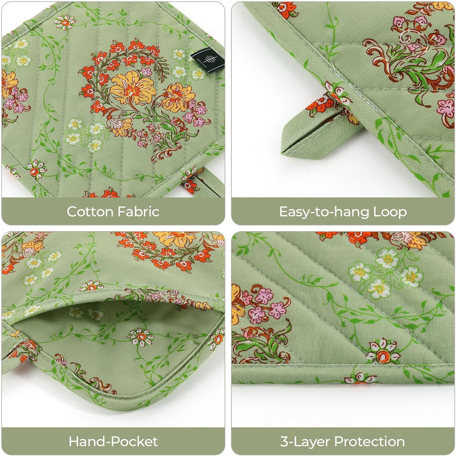 - [Heat-resistant Material] Each pot holder is made from high-quality, heat-resistant materials that can withstand temperatures up to 356℉/180℃. The thick padding ensures maximum insulation and prevents heat from reaching your hands, making it safe and comfortable to handle hot cookware.