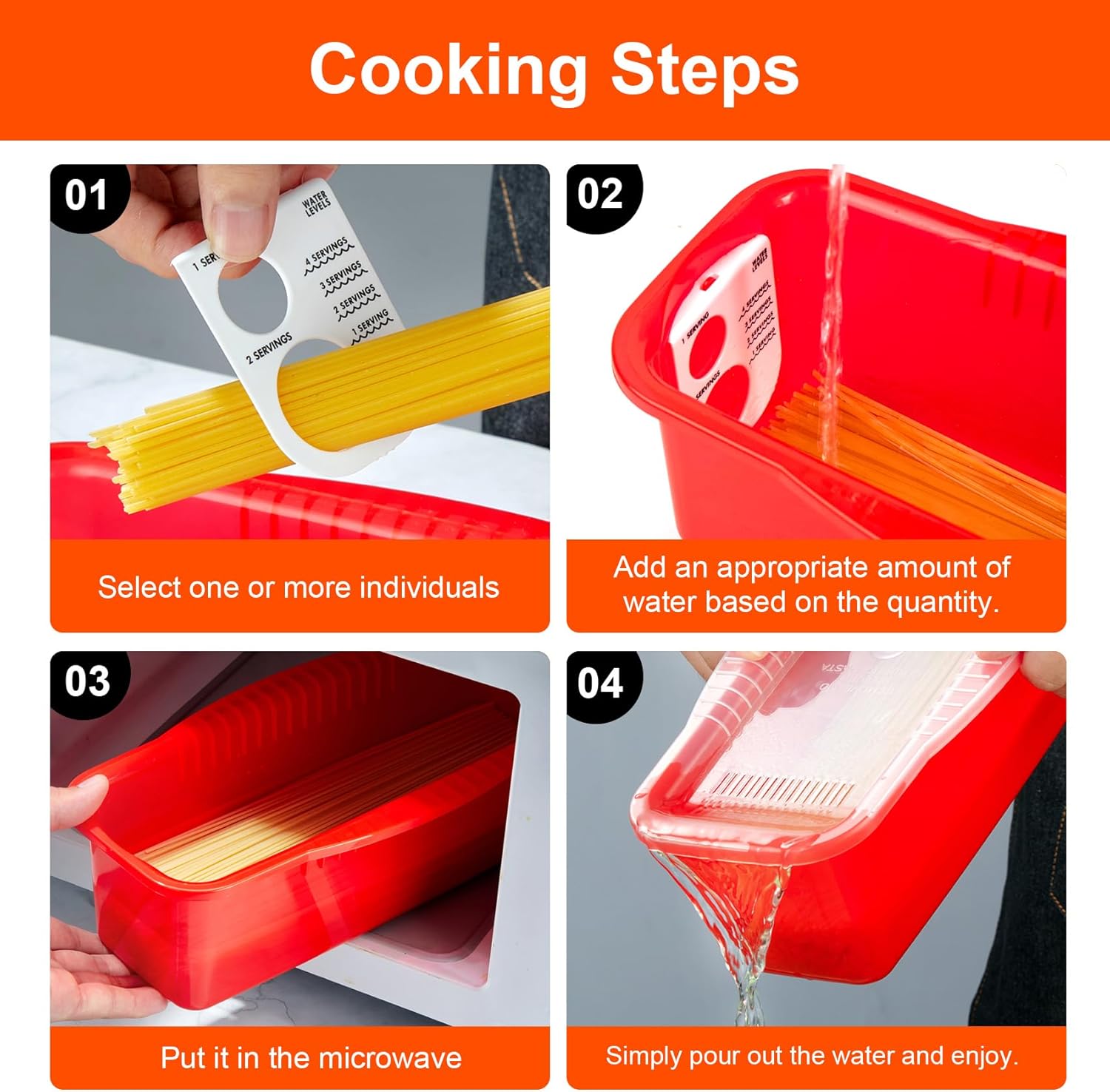 - 【Marks + Guide: Perfect Pasta】This spaghetti cooker comes with a dedicated water level card and detailed illustrated cooking guide. They help you easily get the right water-to-pasta ratio, control cooking results precisely, and avoid overcooked or undercooked noodles. Even kitchen beginners can follow instructions to use this microwave pasta maker, cook perfect pasta on the first try, and enjoy the pride of going from novice to pro.