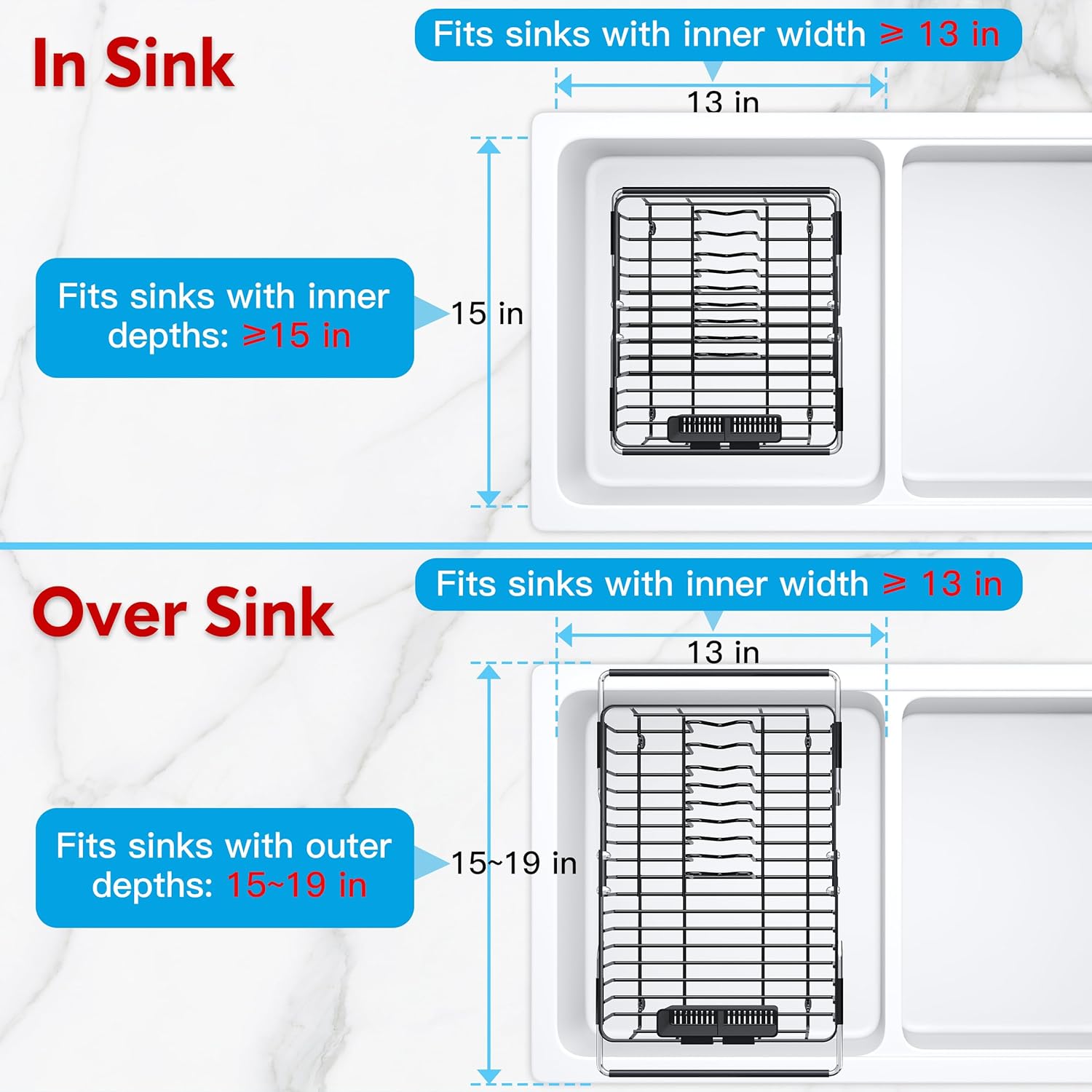 - Fully Expandable Design: ours sink drying rack not only support bars can be adjusted, also can be adjusted the main body rack to increase storage capacity and fits various sink. Sink rack dimensions: 13.1''~16.6''D x 11.8''W x 4''H(not including adjustable support bars length). Please ensure the sink width is between 15 in to 20 inches, the lenght is more than 13 inches for a better fit