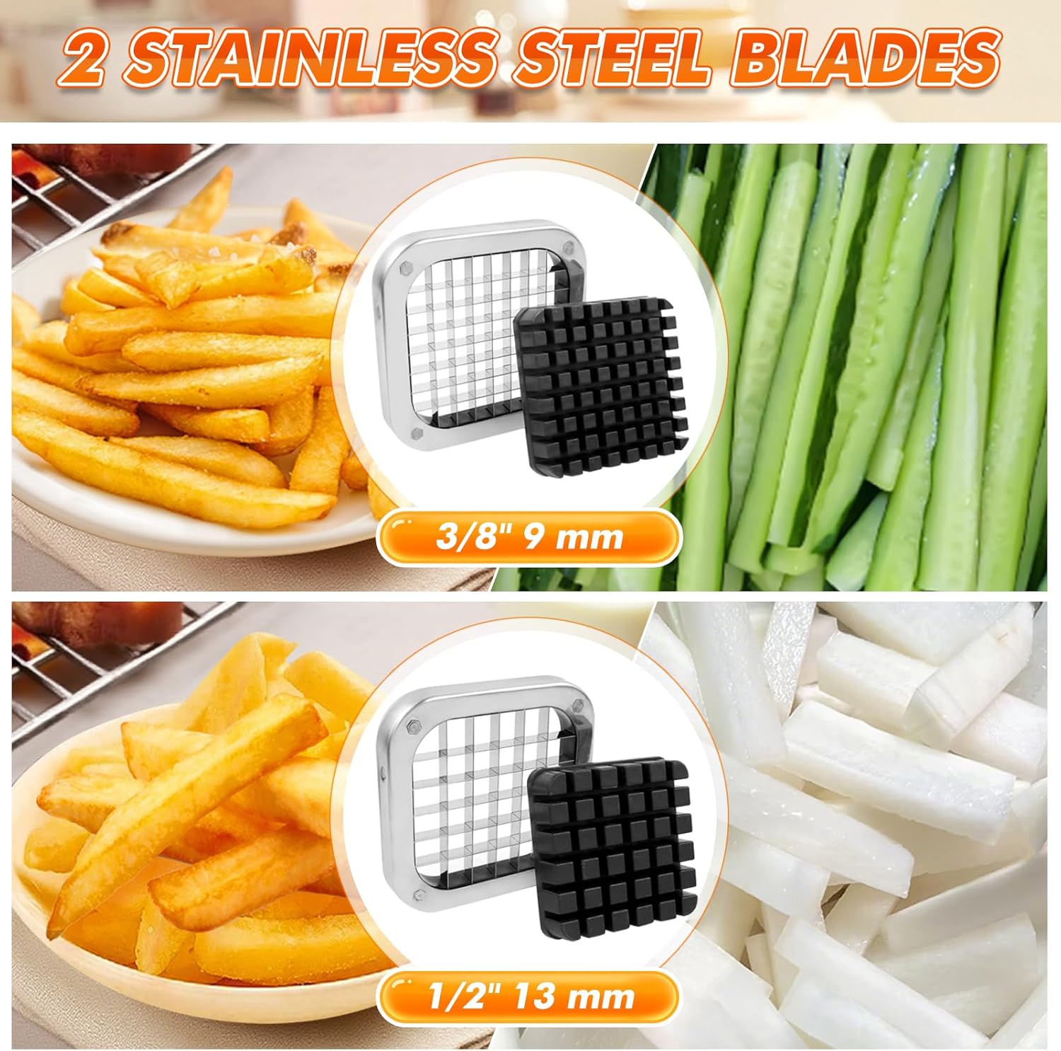 - 2 Super Sharp Blades: 3/8'' and 1/2'' stainless steel blades give you 2 choices and meet your various needs, allowing you to make different sizes of french fries or potato dices at home and saying goodbye to frozen fries
