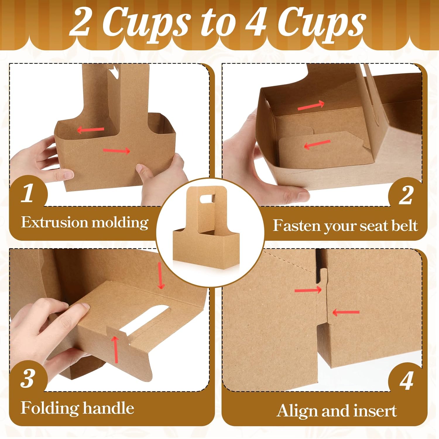- 【Effortless Assembly】Our paper drink carriers can be folded and assembled in a few minutes. Seamlessly combine two carriers to create a 4-cup drink carrier. Unique push-in fold the corner to secure any size cup to prevent it from sliding during delivery.