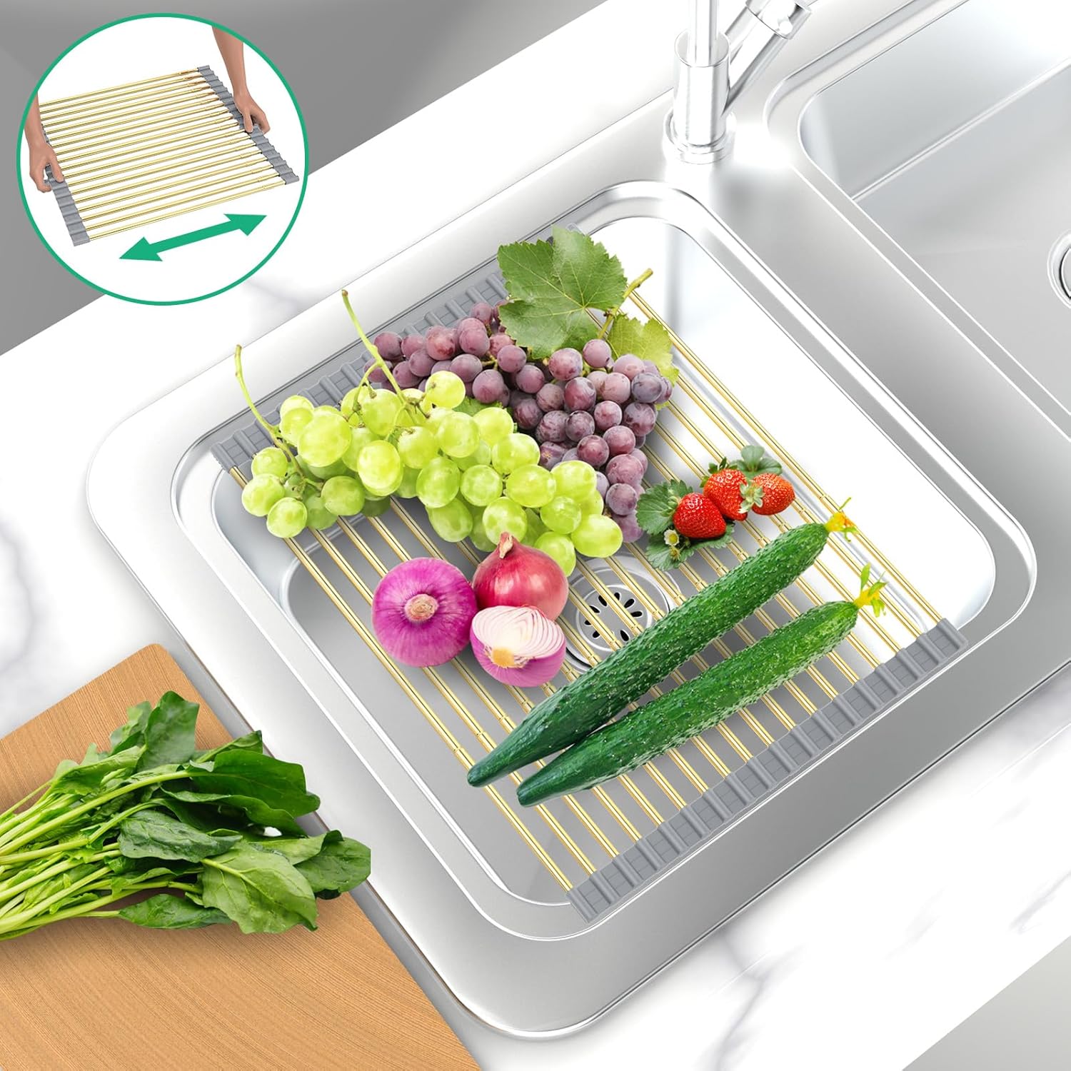 - 【Retractable Sink Drainer Roll Up】- LARGE Telescopic Drainer Rack Roll Up, The size of the roll up drain rack can be shrunk according to the required size at any time, so there is no need to worry about buying too large or too small sink roll up rack; Rolled Up Drying Rack 12.79 inches before expansion, 21.25 inches after expansion.Silicone can be cut according to needs, or the stainless steel tube can be disassembled and assembled at will.