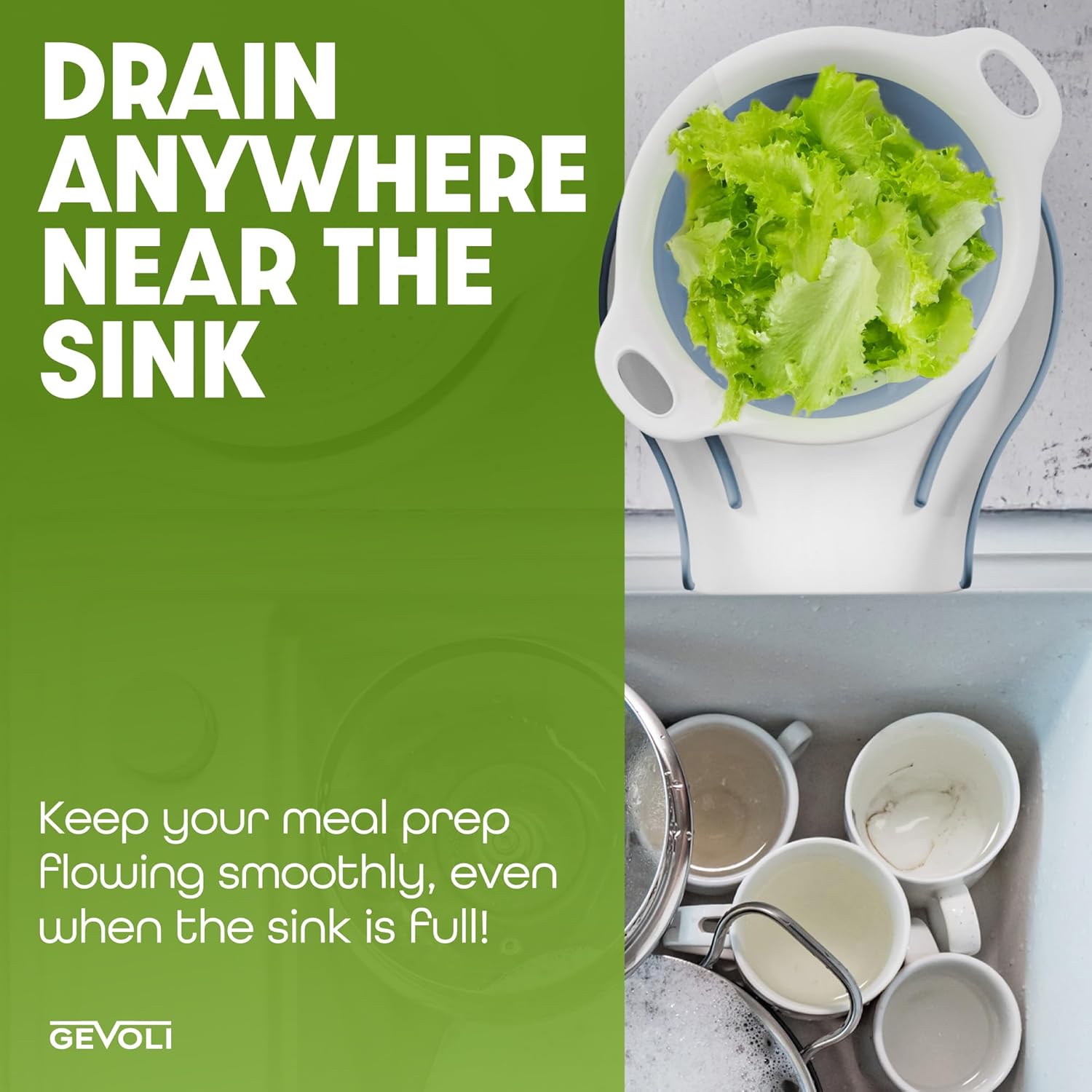 - This set of 2 collapsible colanders features an innovative self-draining base that allows water to drain directly into your sink, even when it's full.