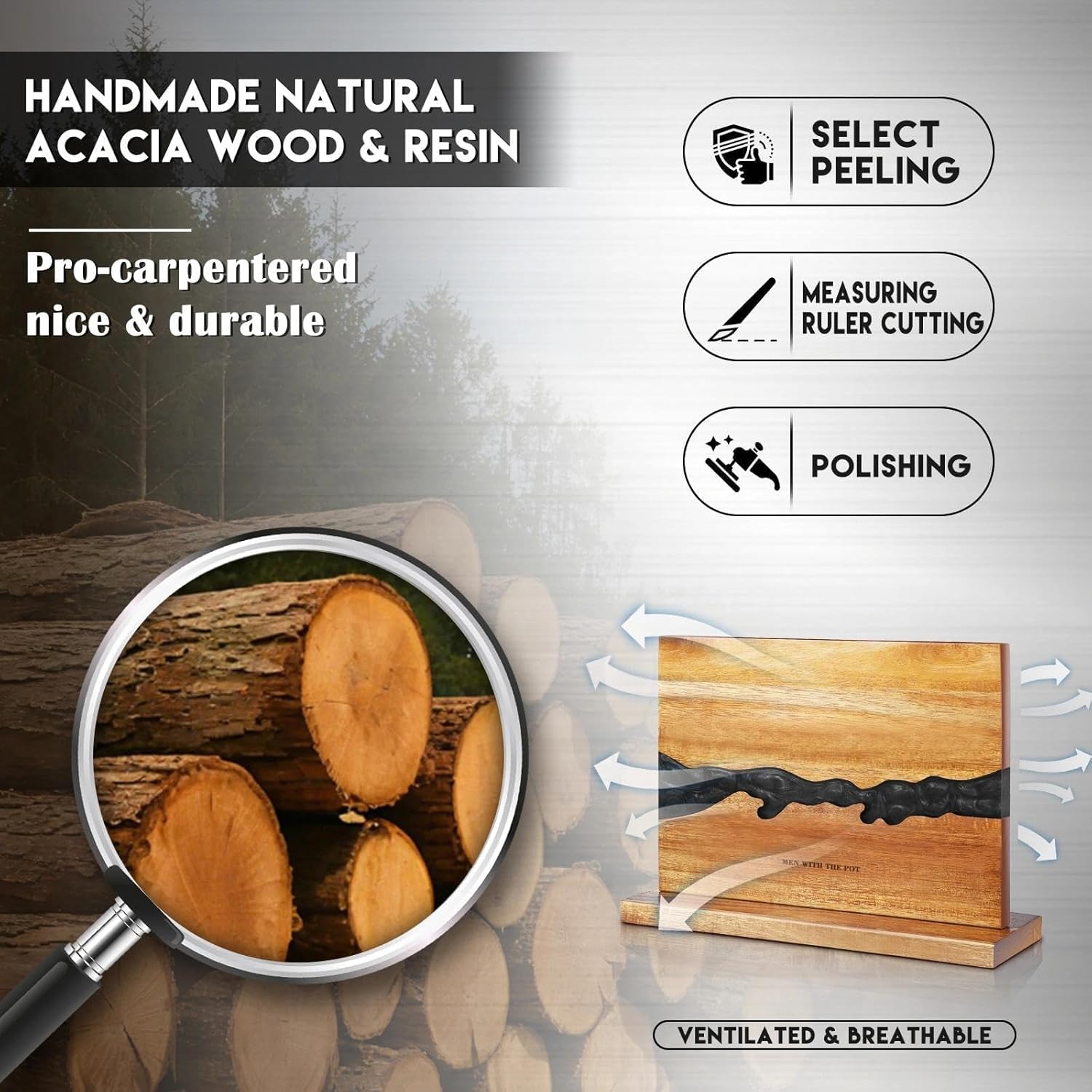 - [High-Quality Materials] Compact knife magnetic block: 14"L x 4.53"W x 10"H. Fits perfectly in any kitchen. Crafted by hand from carefully selected natural acacia wood and black resin. The acacia wood features a warm texture and excellent deformation resistance, scratch-resistant resin for a uniquely elegant look. Weighted thick base of knife holder ensures stability during use, preventing tipping. Wood magnetic knife holder offers both efficient knife storage and stylish countertop appeal