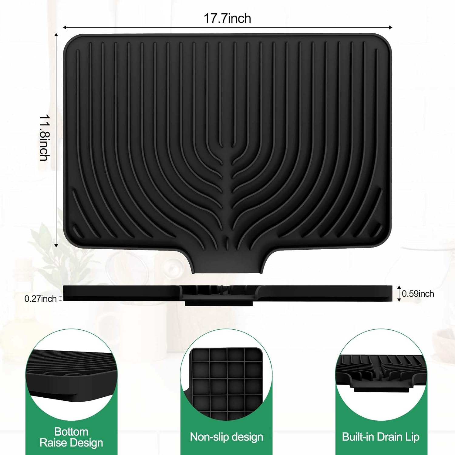 - Dish Drying Mat :17.7"L x 11.8"W x 0.59"H. Dish drying mat has a raised design for air circulation under dishes, speeding up drying. Diagonal ridges remove excess moisture. Its drain lip directs water straight into the sink, keeping countertops dry