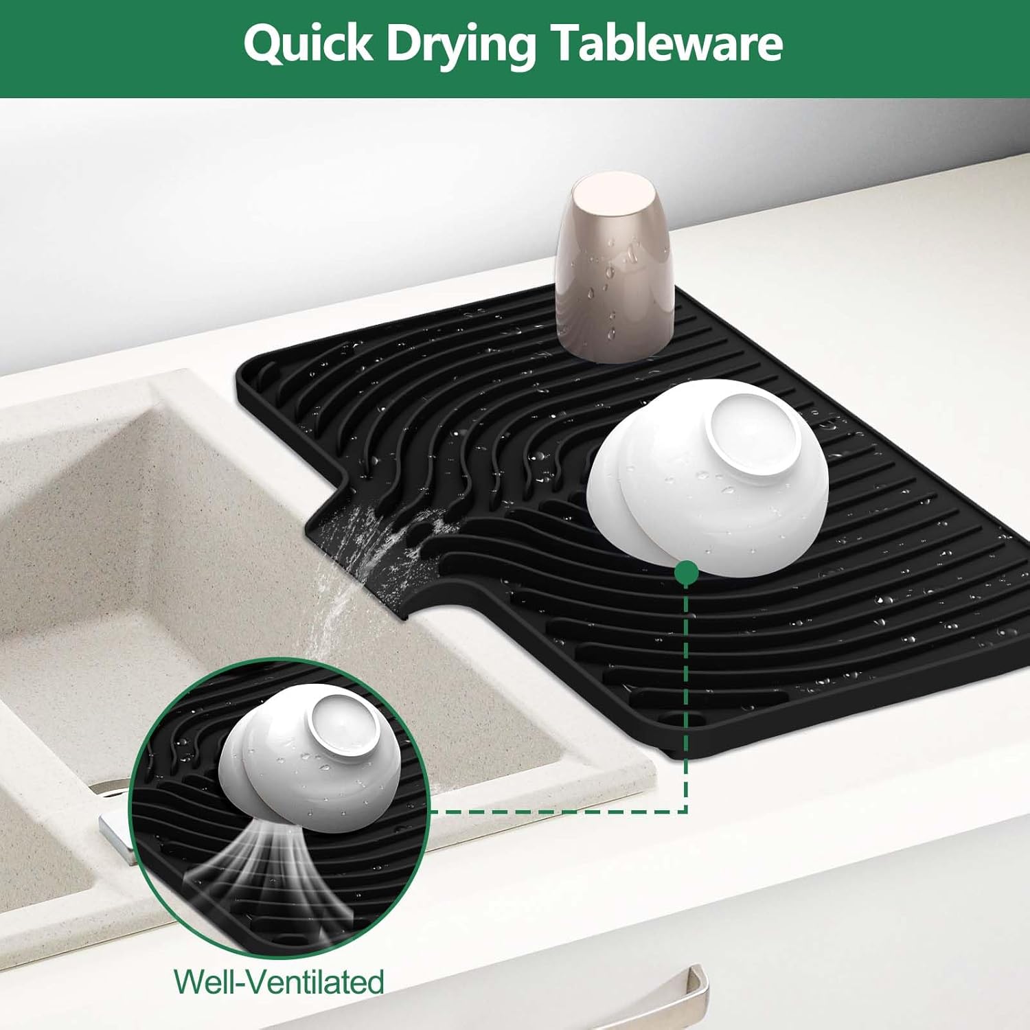 - Food-Grade Silicone Material: The kitchen counter dish drying mats are crafted from high-quality, food-grade silicone. It's durable, soft and resistant to deformation. It offers a safe surface for drying dishes, fruits and veggies, guaranteeing a cleaner and more hygienic kitchen area