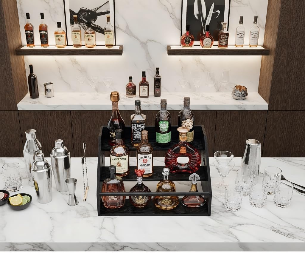 - Compact Yet Large Capacity Design – this 3 tier stepped bar bottle display shelf measures 16" × 11.8" × 9.25", holds up to 4 standard wine bottles per tier to maximize storage without crowding your countertop, and its tiered layout not only enhances the presentation but also makes bottles easier to access.