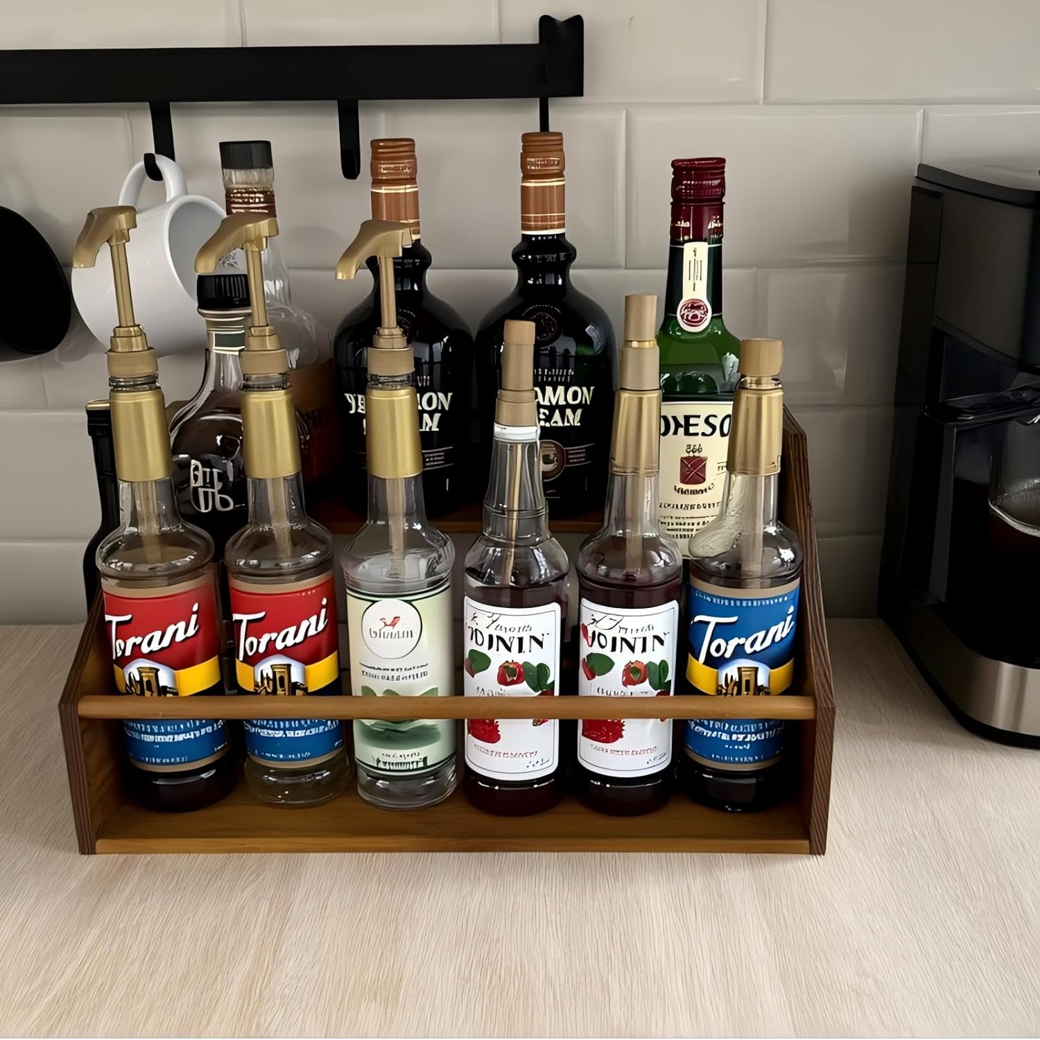 - Versatile Liquor Display Shelf-This bar shelves for liquor bottles is designed from 100% Solid Pine Wood & Waterproof Coating for Enhanced Durability. This liquor shelf not only showcases your liquor collection, but also serves as an elegant small wine rack, coffee syrup rack, or other bar accessories and coffee bar organizer on any countertop—perfect for home bars, coffee stations, or cozy kitchens.