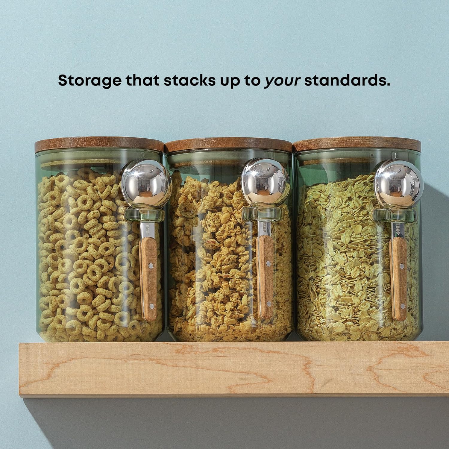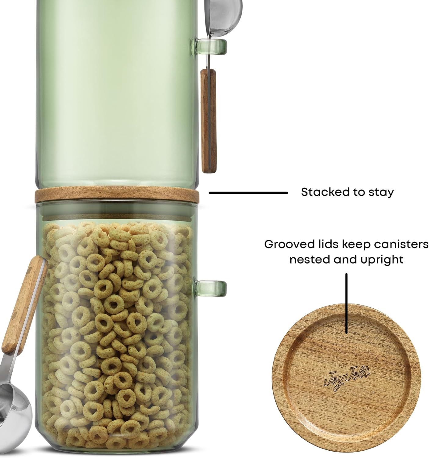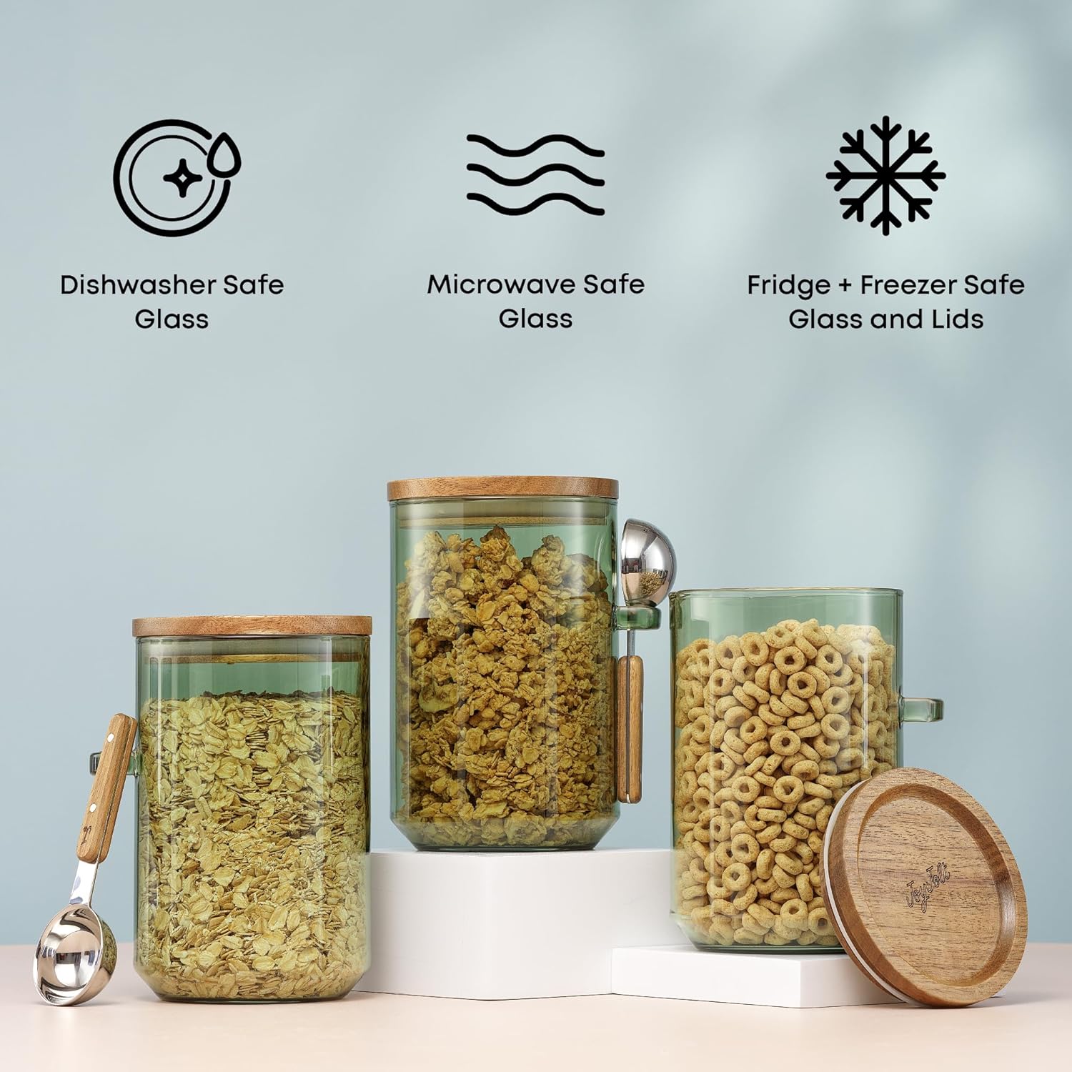 JoyJolt Holden 32oz Stackable Glass Storage Containers with Lids and Scoops, Airtight Food Canister Set of 3 w/Acacia Wood Lids, Round Stacking Pantry and Kitchen Containers w/Scoop | Sage Green