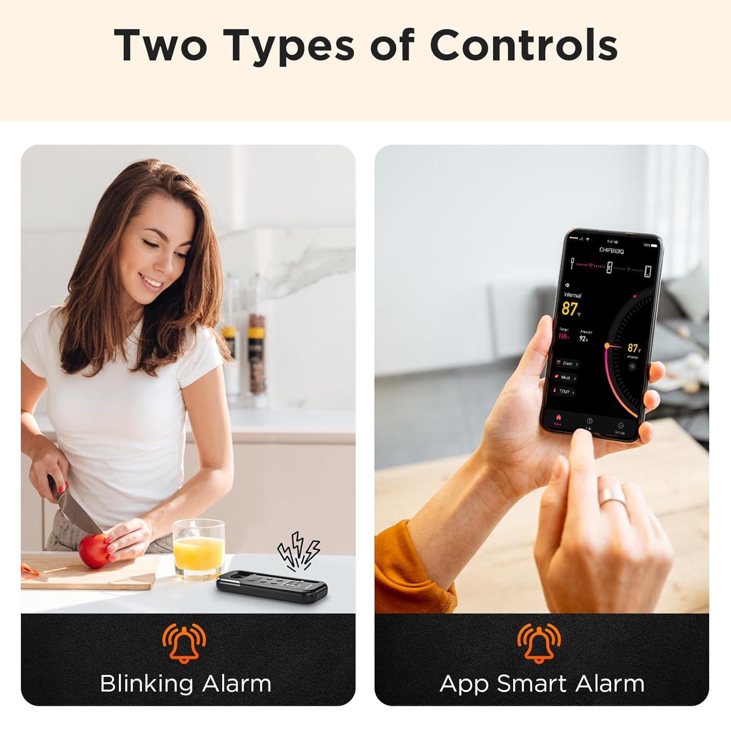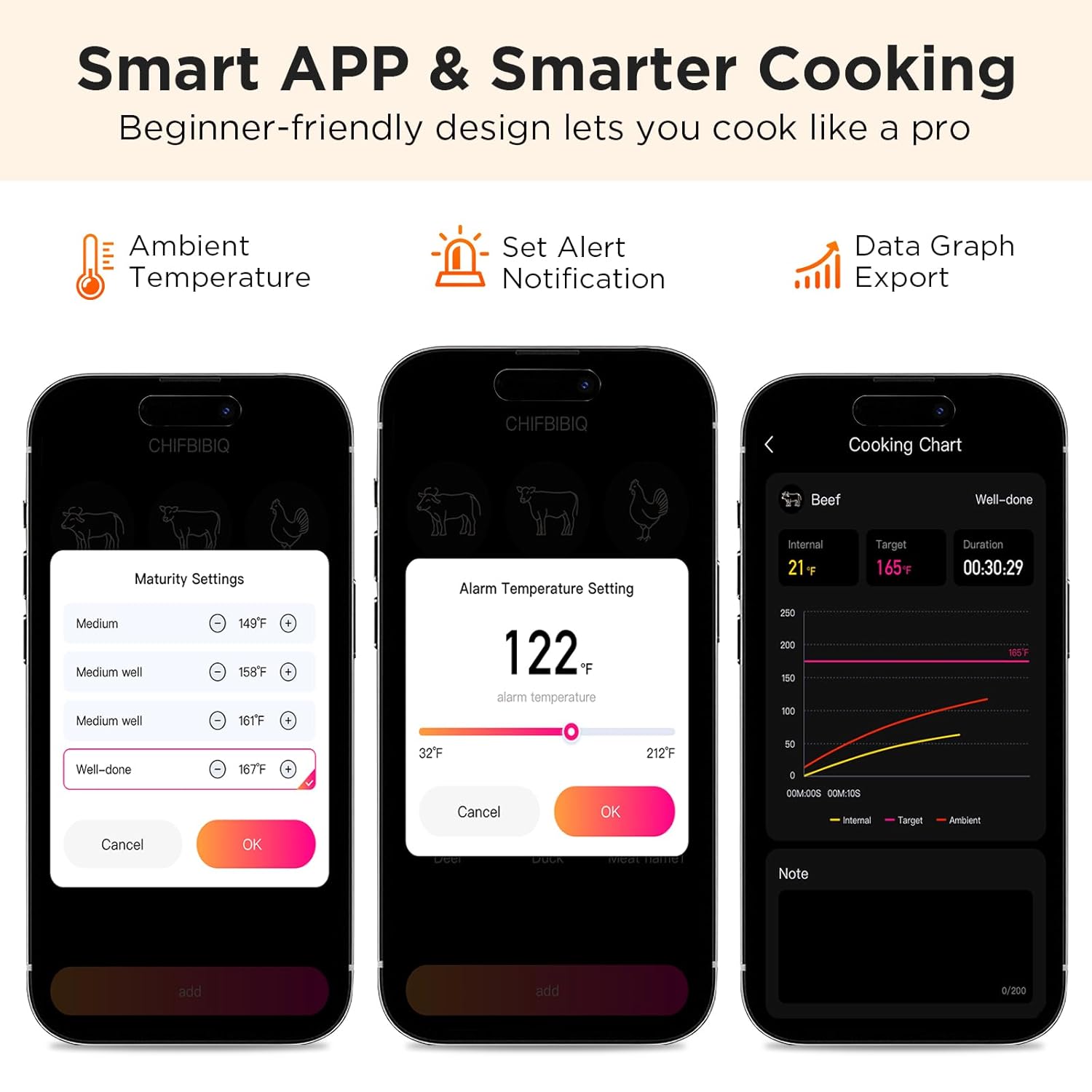- Smart APP Alerts or Standalone Base Use: Full control with the CHEFBBQ App for custom temps and alerts. No phone needed? The rechargeable LCD base works independently as a complete digital thermometer, offering ultimate flexibility