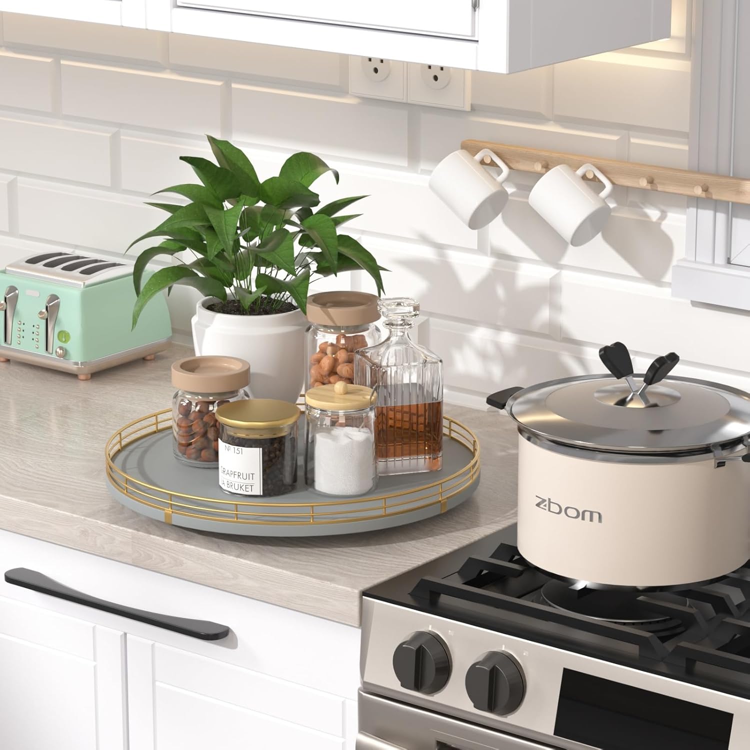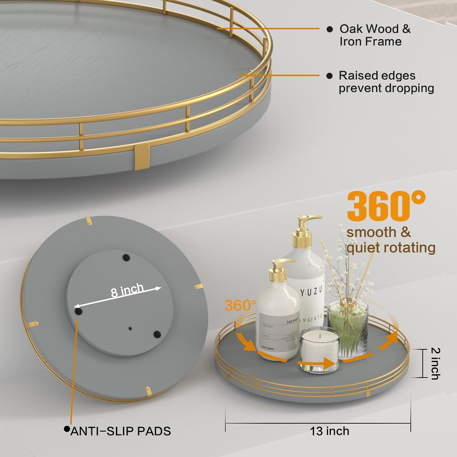13" Wooden Lazy Susan Turntable for Cabinet – Round Rotating Spice Rack Organizer, Gray Kitchen Countertop Tray for Dining Table & Pantry Storage(Gray & Gold)