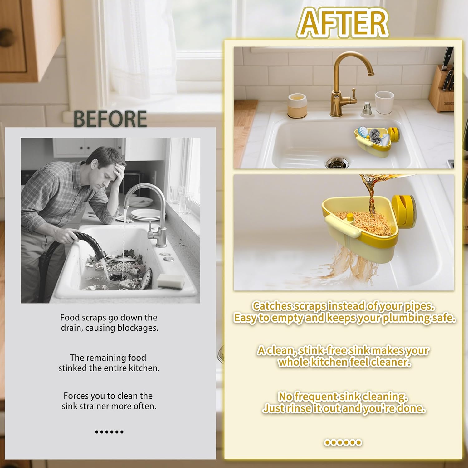 - 2-in-1 Strainer & Sponge Holder: Not just a strainer, it also holds your sponge, brush, or scrubber right by the faucet. Everything stays organized and within reach—no more clutter around the sin.
