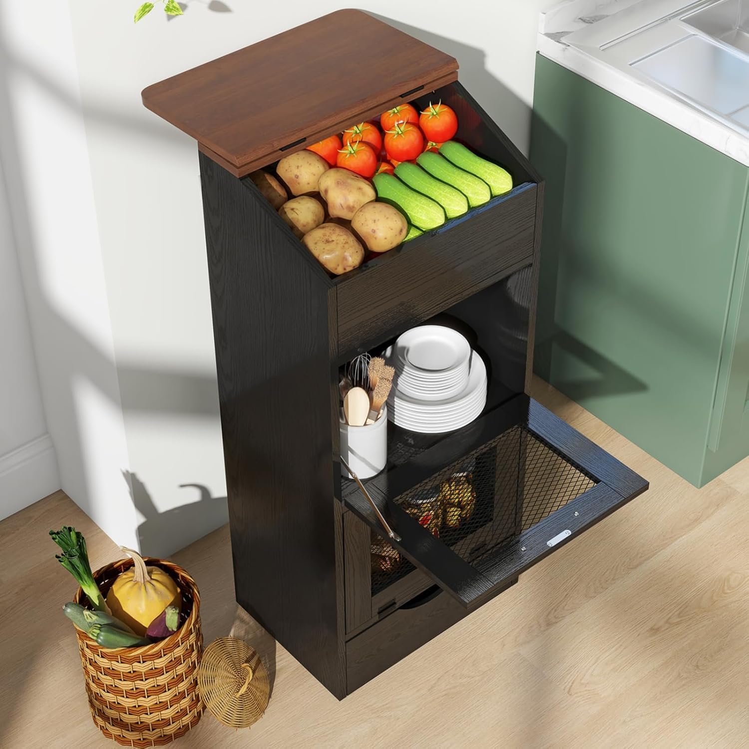 - 🧺️[4-Tier Smart Vegetable Organizer]: Maximize your storage capacity with intelligently designed compartments: flip-top lid for daily bread access, 2 mesh-door sections for potatoes/onions, and a spacious wheeled drawer for larger items. Keep everything organized and within reach.