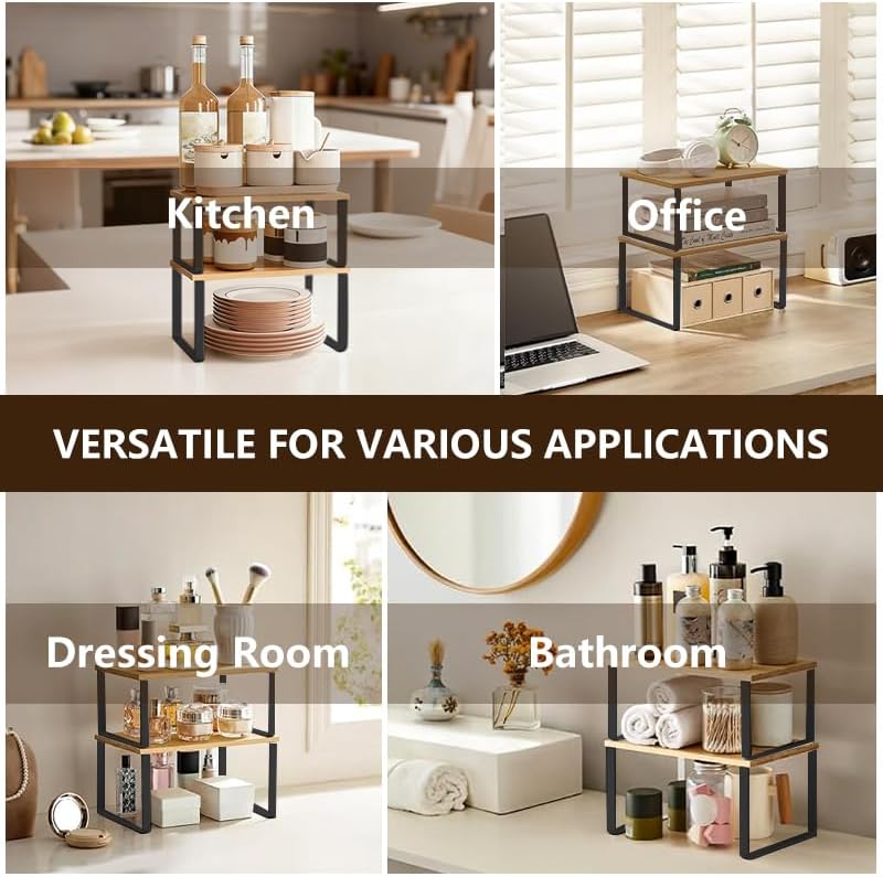 Cabinet Organizer Shelf, Set of 2 Stackable Counter Shelves, Wood and Metal Cabinet Storage Rack, Expandable Kitchen Spice Rack, Multi-Purpose Shelf for Pantry, Bathroom, or Tabletop