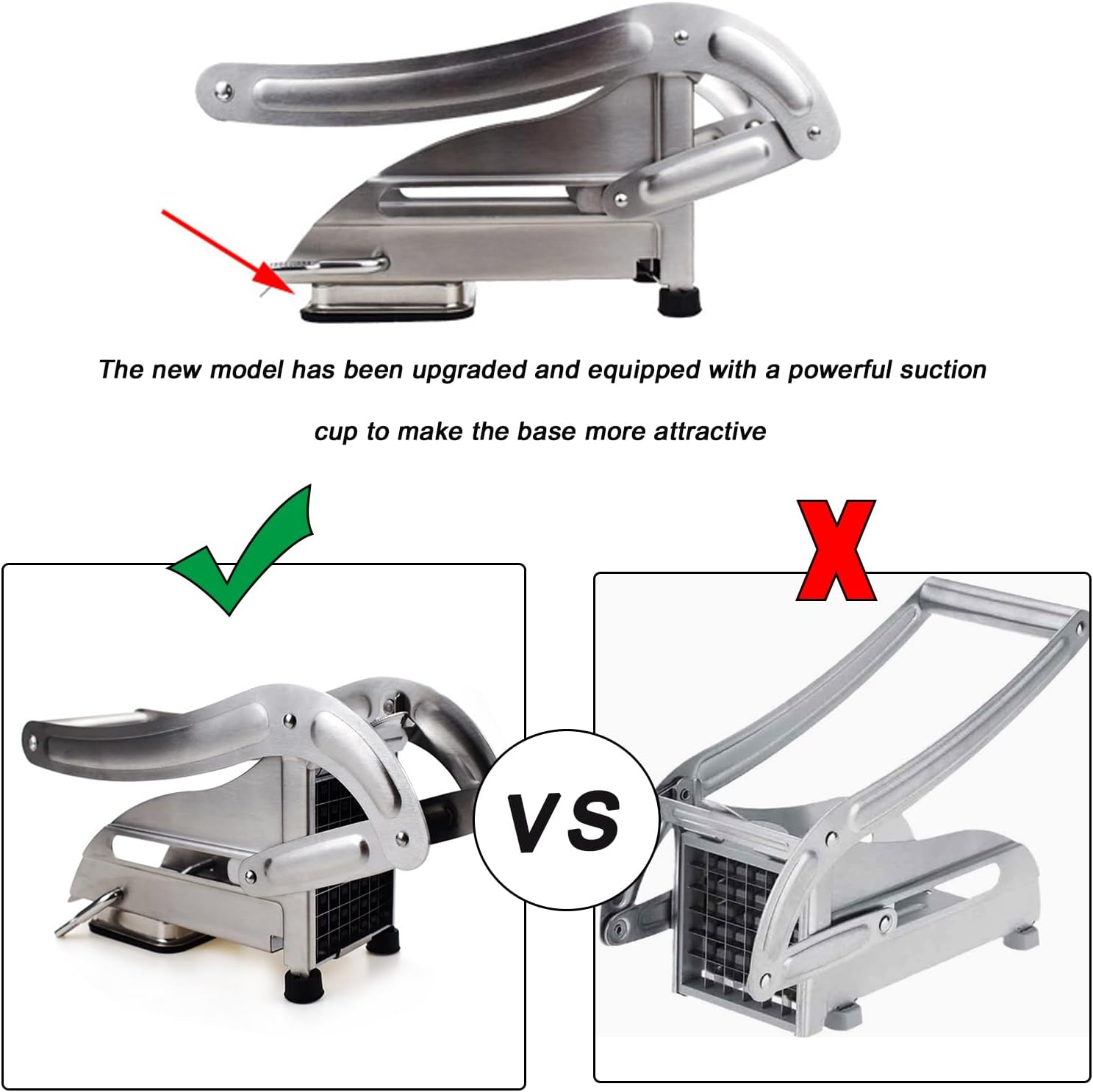 - 【Easy to Use & Quick Cutter】Potato slicer adopts a longer handle design. Our French fries cutter is equipped with strong suction locking technology on the base to prevent the machine from moving during the cutting process for optimal leverage while cutting. Use the lever principle to achieve labor-saving and consistent cutting through an extended resistant handle.
