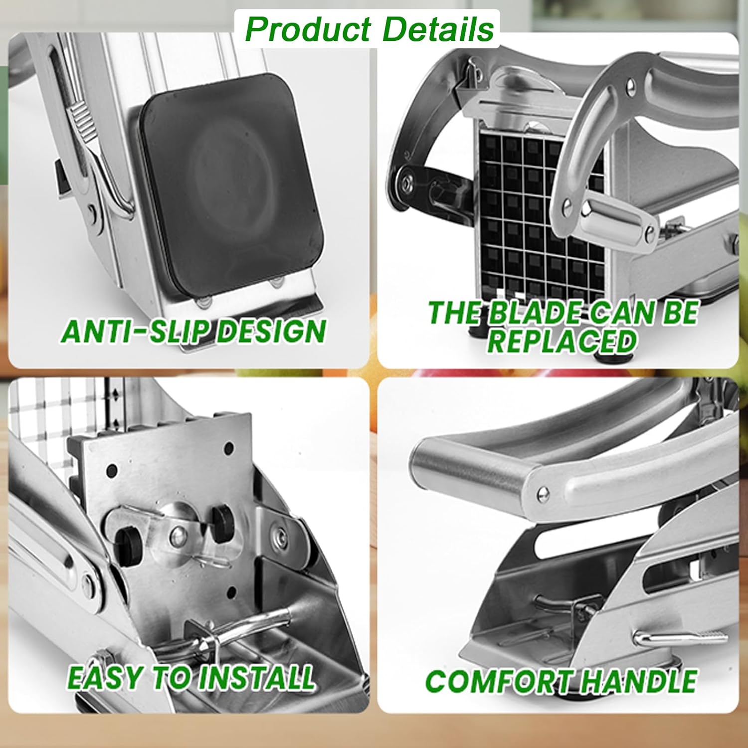 - 【MULTIPURPOSE】Potato cutter machine comes with 2 easily interchangeable blades, providing perfect cutting results for regular or thinner sized fries. It's perfect for cutting potatoes, carrots, vegetables, onions, zucchinis, cucumbers. You can also cut sweet potatoes, we recommend microwaving them for 1 minute first to soften, then let them cool before handling