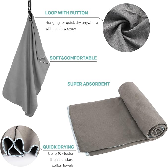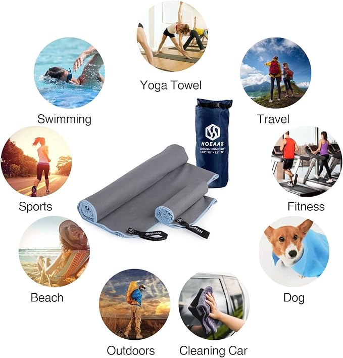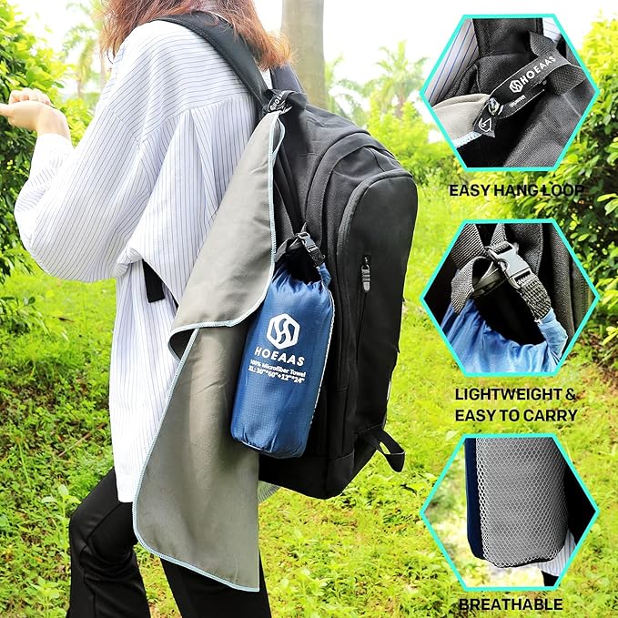 - SUPER ABSORBENT & QUICK DRYING: HOEAAS microfiber camping towel is made of soft and skin-friendly microfiber fabrics, which super absorbent and fast drying. Soaks up 5X its weight in water and dries nearly 10X faster than cotton towel, repeat use it a short time, no bad odors. So you never have to worry about your microfiber beach towels soiling or stinking up the rest of your gear. After dry your sweat or body water, Spread out or hang up the quick dry towel will be dry in minutes!