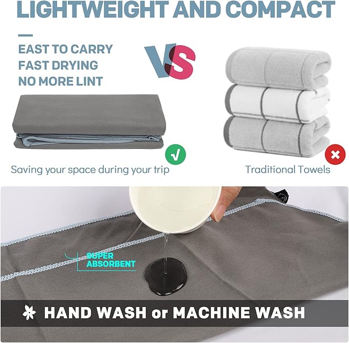 - MULTI-FUCNTIONAL QUICK DRY TOWEL & GIFT IDEA: Lightweight and compact microfiber towel for travel is super versatile for any situation. Such as backpacking, travel, camping, hiking, swimming, yoga, golf, gym, fitness, exercise. Perfect for covers your sun lounger, deck chair or camping undera beach umbrella&sun shelter. The travel towel also looks really fashionable and sporty, which makes it a great gift idea for your family and friends. Of course, if you have any problem, please contact us.