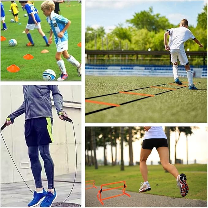 • Agility Training Kit Package: The hurdles training equipment package come with: Agility ladder with 12 rungs*1,Adjustable Hurdles*4, Disc Cones*12, Leg Strength Trainer*2,Running Parachute*1,Jump Rope*1,Pegs*4,Carry Bag*1
