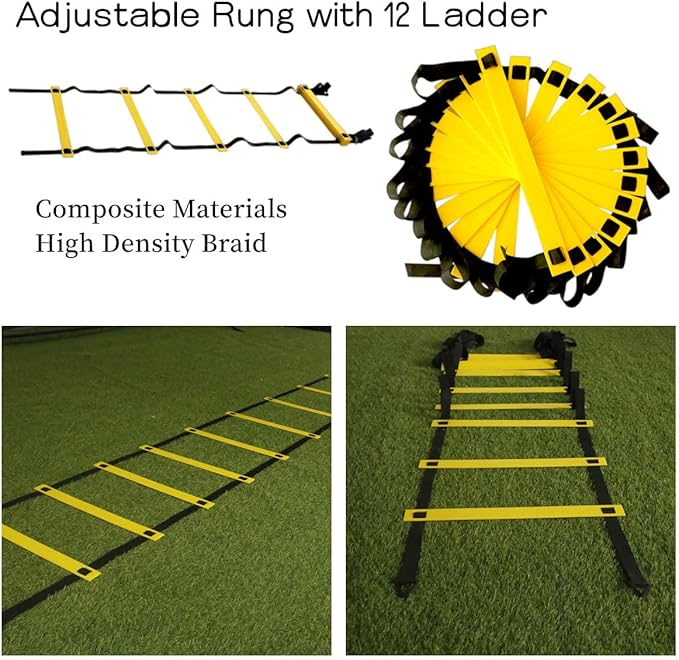 - Agility Training Kit Package: The package come with:Agility ladder with 12 rungs*1,Adjustable Hurdles*4, Disc Cones*12, Resistance Bands *5,Running Parachute*1,Jump Rope*1,Pegs*4,Carry Bag*1