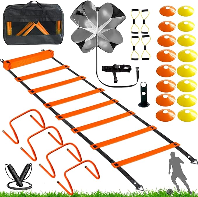 • Agility Training Kit Package: The agility training equipment package come with:Agility ladder with 12 rungs*1,Adjustable Hurdles*4, Disc Cones*16, Resistance Bands *4,Running Parachute*1,Jump Rope*1,Pegs*4,Carry Bag*1