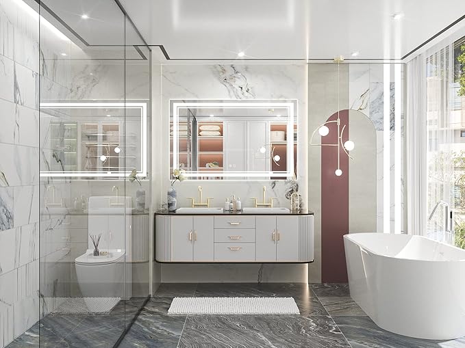 - 【Dimmable & Memory】 The brightness of this modern led mirror is dimmable, short press to turn the mirror light on/off while long press on the button can adjust the brightness of the mirror (10%-100%). With the UL listed LED power driver, this wonderful bathroom mirror are available for an excellent lighting experience. When the LED mirror is restarted after a power failure, it will return to the last use, no need to adjust again.