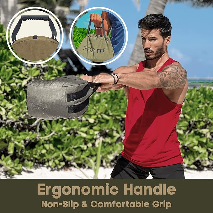 - GUARANTEED LEAK-PROOF & DURABLE | NON-SLIP HANDLE. The Polyfit Kettlebell Sandbag is secured with enforced stitching on both the velcro and the zipper, so you can do your strength training and conditioning exercises with confidence. The handle is designed with a comfortable grip, which allows for better execution.