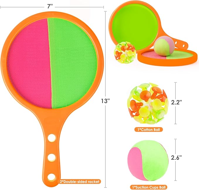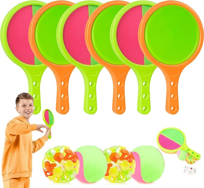 - Toss and Catch Velcro Ball Set: Includes 6 catch rackets and 6 balls(cotton ball and suction cups ball). Pick yours up today and enjoy the outdoors with your family and friends!