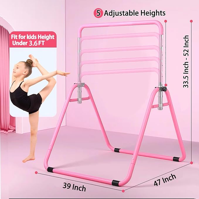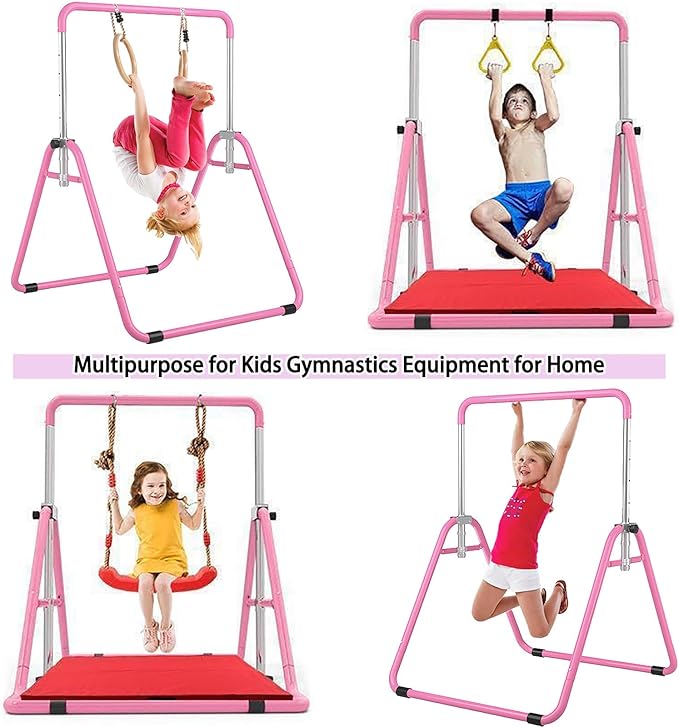 - 【4 Adjustable Heights】Home gymnastics bar will grow up with your kids, it has 4 heights to adjust: 35''/41''/47''/53'' to meet different needs and skill levels, ideally suited for junior gymnastics.