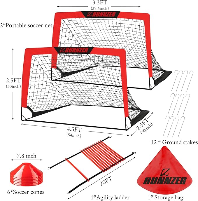 - Package included: Two 4' x 3' soccer nets, 1 adjustable 20FT agility ladder, 12 ground stakes, 8 soccer cones and 1 kids soccer goal portable bag. Make practicing soccer enjoyable for kids with reliable soccer goals that provide hours of entertainment