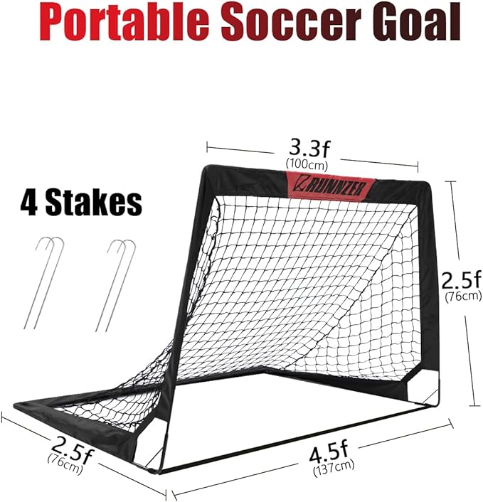 - Easy to install: Installation is a breeze: insert the rods to the cloth cover, connect together with L-shaped connector, and secure it with ground stakes. Our soccer goals for backyard unfolded size: 3.3 f / 4.5 f x 2.5 f x 2.5 f
