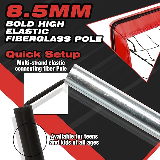 - THICK FIBERGLASS POLES: The soccer goal with 8.5 mm high-elastic fiberglass poles,its elasticity effect is 1.3 times that of ordinary fiberglass poles, and it can perform well even in the face of powerful shots.
